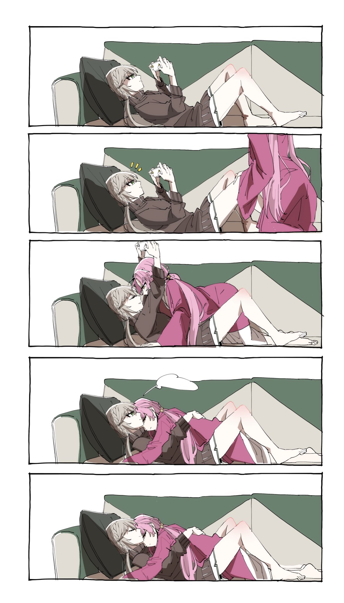 2girls barefoot between_legs brown_skirt brown_sweater closed_mouth commentary_request couch cuddling from_side fu_xuan_(honkai:_star_rail) green_eyes highres holding holding_phone honkai:_star_rail honkai_(series) hug light_brown_hair long_hair long_sleeves lying_on_person multiple_girls on_couch phone pink_robe qingque_(honkai:_star_rail) robe skirt sleeping sleeping_on_person sukebeningn sweater yuri