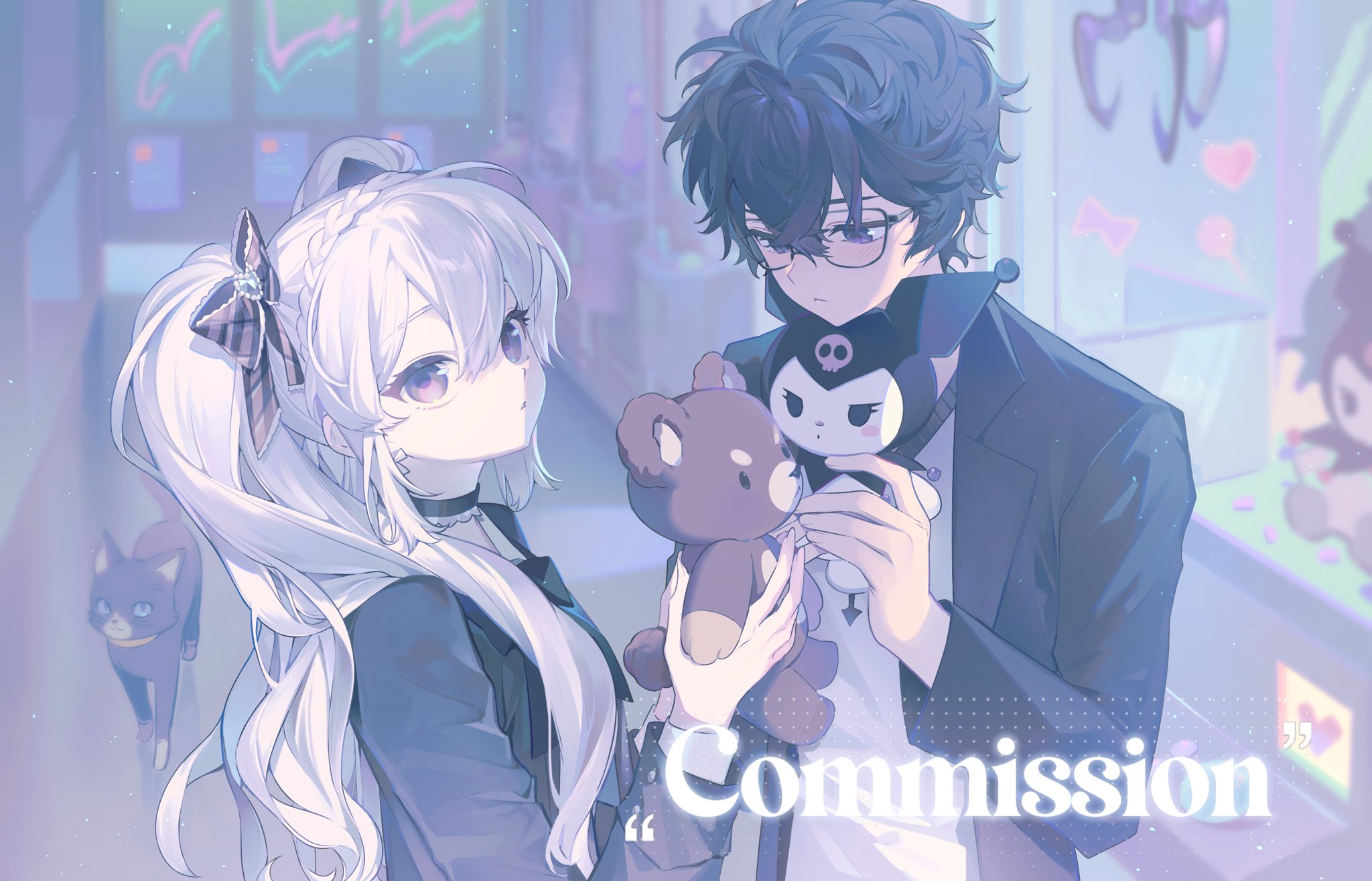 1boy 1girl arcade black_bow black_choker black_hair black_jacket bow braid cat character_doll choker closed_mouth commission crane_game doll glasses hair_between_eyes hair_bow hands_up highres holding holding_stuffed_toy jacket kuromi long_hair long_sleeves looking_up morgana_(cat)_(persona_5) morgana_(persona_5) my_melody_(series) naku_(naku999ziye) original purple_eyes sanrio shirt short_hair stuffed_animal stuffed_toy teddy_bear twintails upper_body watermark white_hair white_shirt