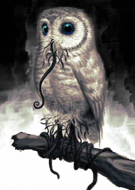 animal_focus bird blue_eyes branch full_body horror_(theme) kahadu_(kawazu) monochrome monster no_humans original owl solo spot_color tendril white_fur