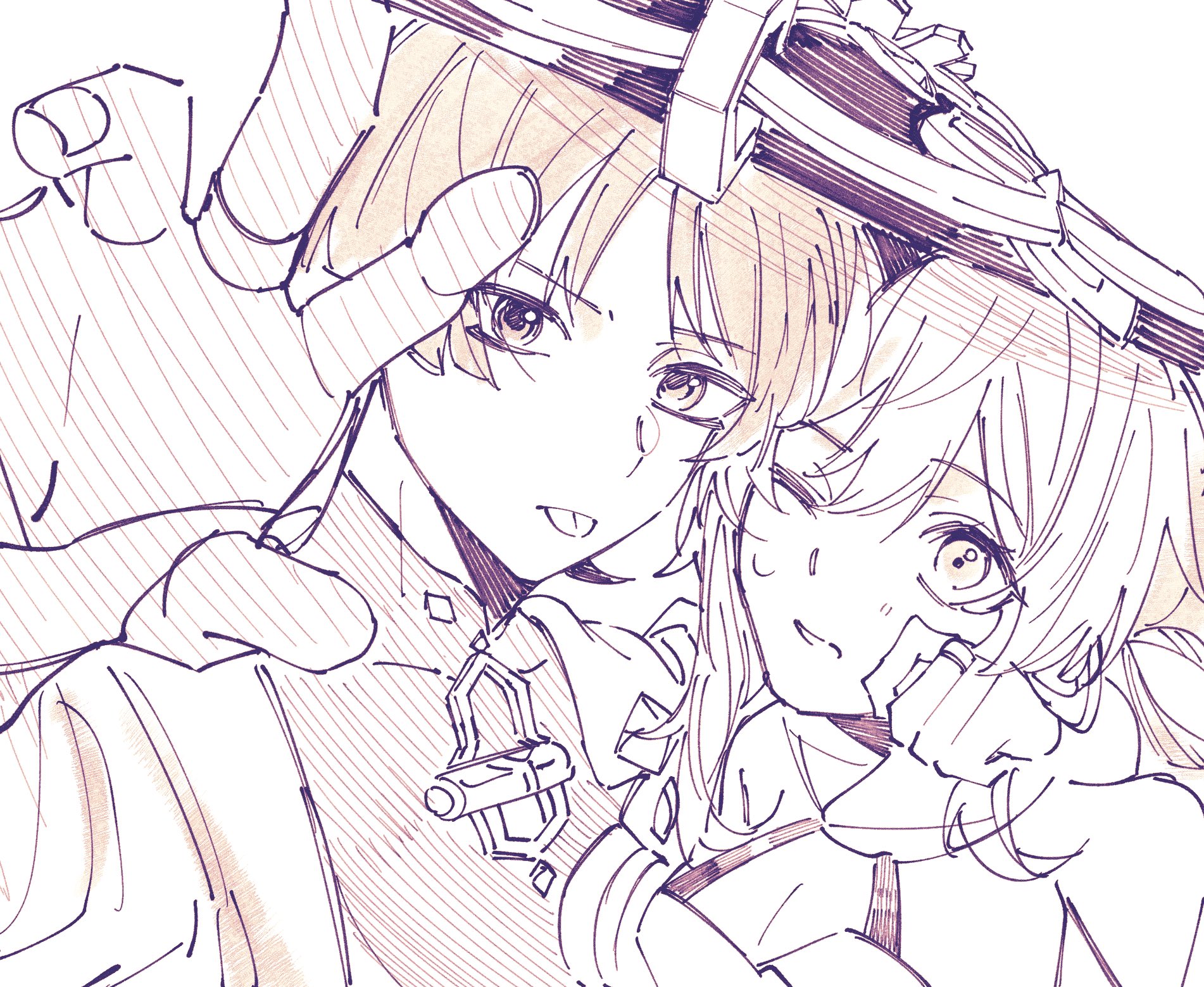 1boy 1girl brmbr couple genshin_impact hand_around_neck hat hetero highres jewelry looking_at_viewer lumine_(genshin_impact) one_eye_closed open_mouth partially_colored ring scaramouche_(genshin_impact) short_hair simple_background sketch sweat tongue tongue_out wanderer_(genshin_impact) white_background