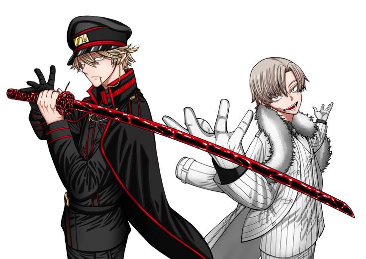 2boys arm_up black_cape black_gloves black_pants black_shirt blonde_hair breasts cape closed_mouth gloves grey_eyes hand_up hands_up hat long_hair looking_at_viewer male_focus multiple_boys open_mouth pants serious shirt simple_background small_breasts sword todoroki_hayate tougen_anki weapon white_background white_gloves white_pants white_shirt yellow_eyes