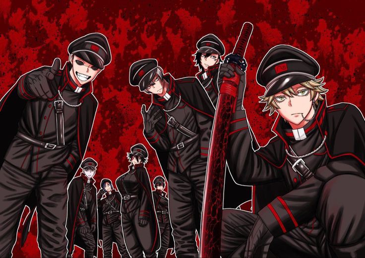 1girl 6+boys black_hair black_jacket black_pants black_shirt blonde_hair closed_mouth grey_hair hat hirunuma_akari huwa_shinichi jacket looking_at_viewer multiple_boys otohara_kyoutarou pants serious shirt sitting smile sword todomeki_gou todoroki_hayate torikai_uri tougen_anki umitsuki_miyo weapon yellow_eyes