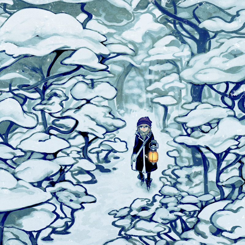 1girl bag beanie boots coat forest hat kahadu_(kawazu) lantern nature original shoulder_bag snow solo tree walking winter winter_clothes