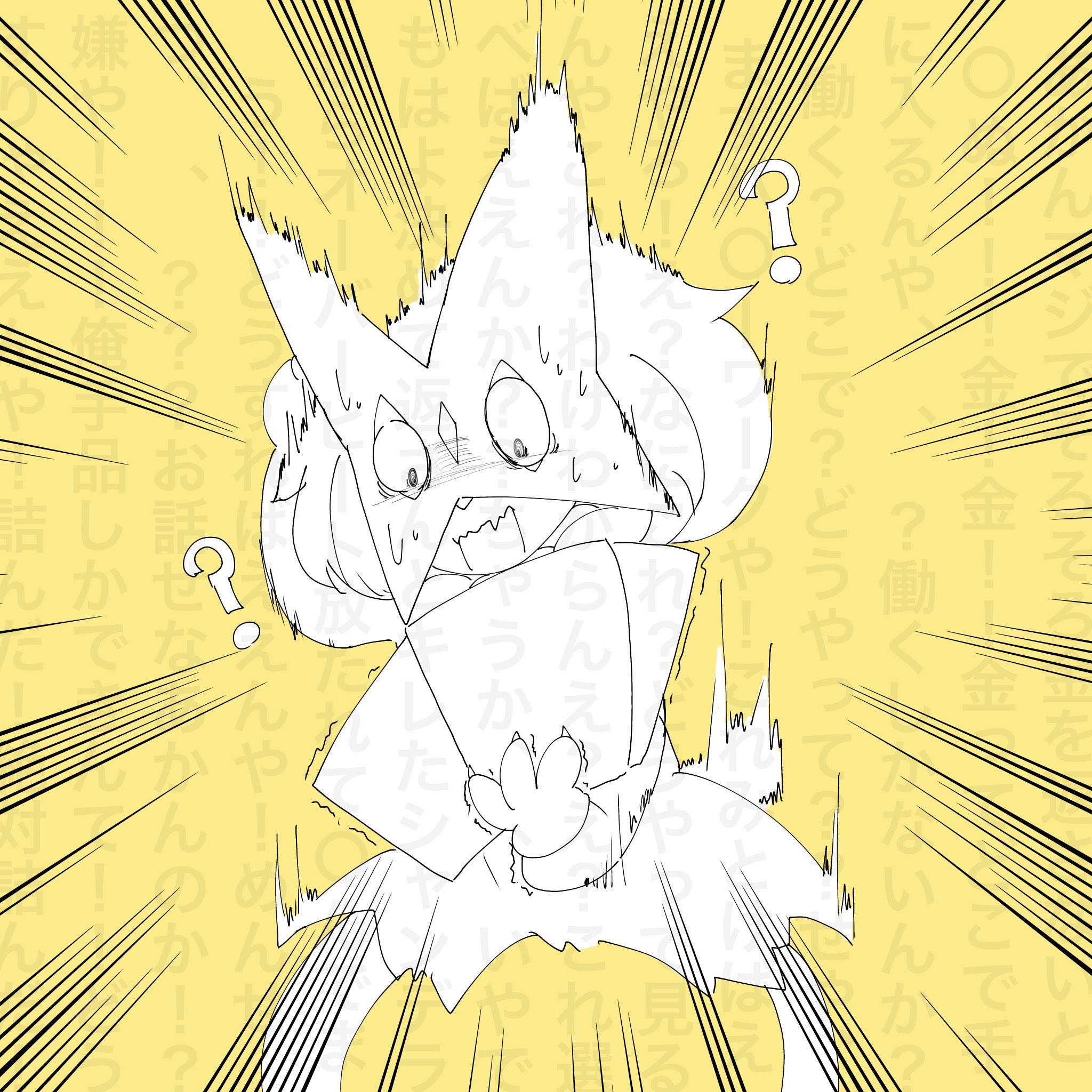 1other ? animal_hands animal_nose bags_under_eyes claws constricted_pupils emphasis_lines fang furry greyscale_with_colored_background hand_up highres holding holding_paper japanese_text legs_apart looking_down meowscarada nervous_sweating nintendo open_mouth other_focus paper pokemon pokemon_(creature) rize_(r) short_hair short_tail skin_fang solo standing sweat tail translation_request trembling turn_pale wavy_mouth wide-eyed yellow_background