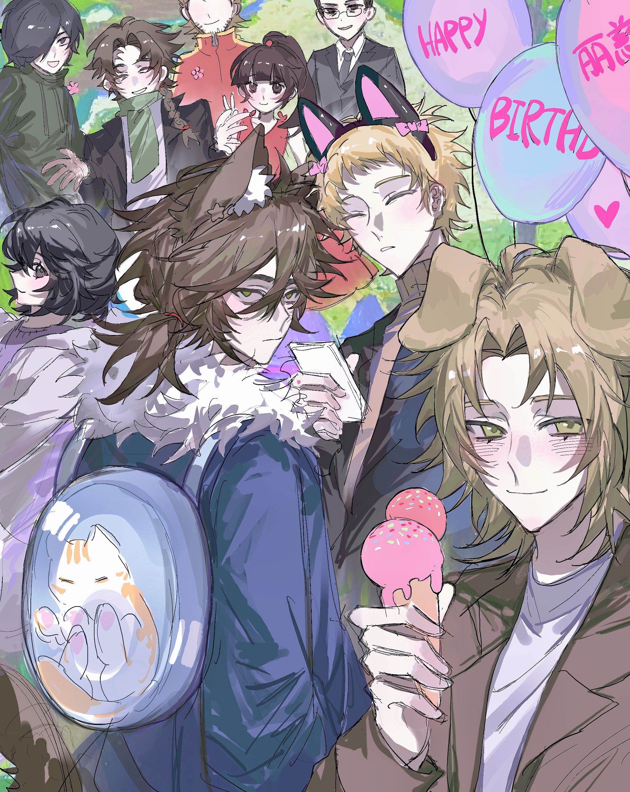 2girls 6+boys absurdres ahoge aiba_ibuki animal_ear_fluff animal_ear_hairband animal_ears atou_haruki backpack bag balloon black_eyes black_hair black_jacket black_necktie blonde_hair blue_bag blue_jacket brown_eyes brown_hair brown_jacket brown_sweater chinese_commentary closed_eyes closed_mouth commentary dog_boy dog_ears dress english_text fake_animal_ears fur-trimmed_jacket fur_trim glasses green_eyes green_hair green_jacket grey_shirt hair_between_eyes hair_over_one_eye hairband happy_birthday harada_minoru highres holding holding_ice_cream_cone ice_cream_cone isoi_reiji jacket jiuyejiuxi kumazaki_karen kumazaki_riku kurachi_terumi light_brown_hair long_sleeves multiple_boys multiple_girls necktie open_clothes open_jacket open_mouth parted_bangs ponytail purple_shirt red_dress saibou_shinkyoku sanpaku scar scar_on_face scar_on_forehead shinano_eiji shirt short_hair sleeveless sleeveless_dress smile sweater translated turtleneck turtleneck_sweater white_shirt yanagi_nina