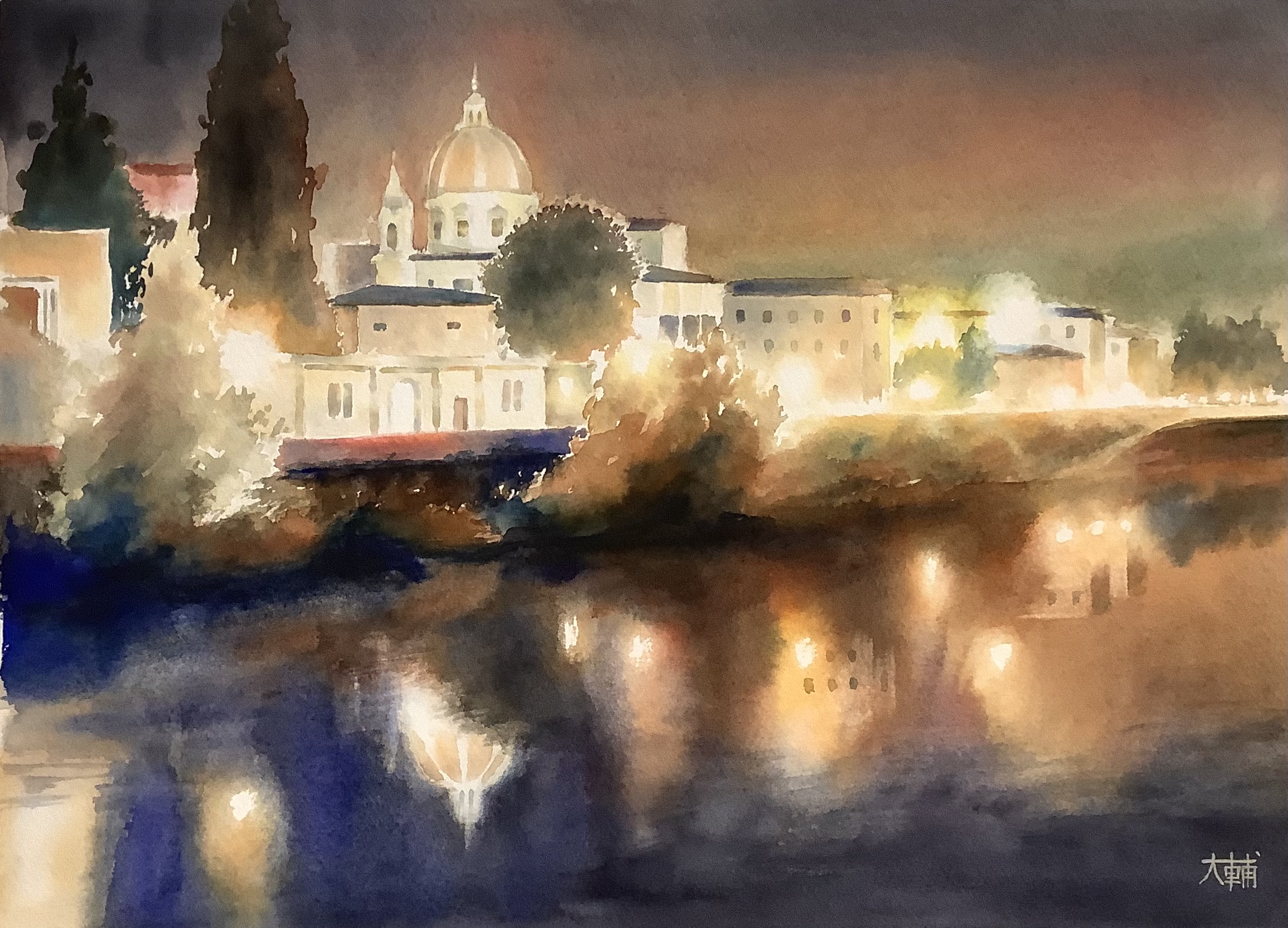 building bush cloud cloudy_sky didi_daisukedoi dome highres light night no_humans orange_sky original painting_(medium) reflection reflective_liquid river riverbank shadow sky town traditional_media tree water watercolor_(medium)
