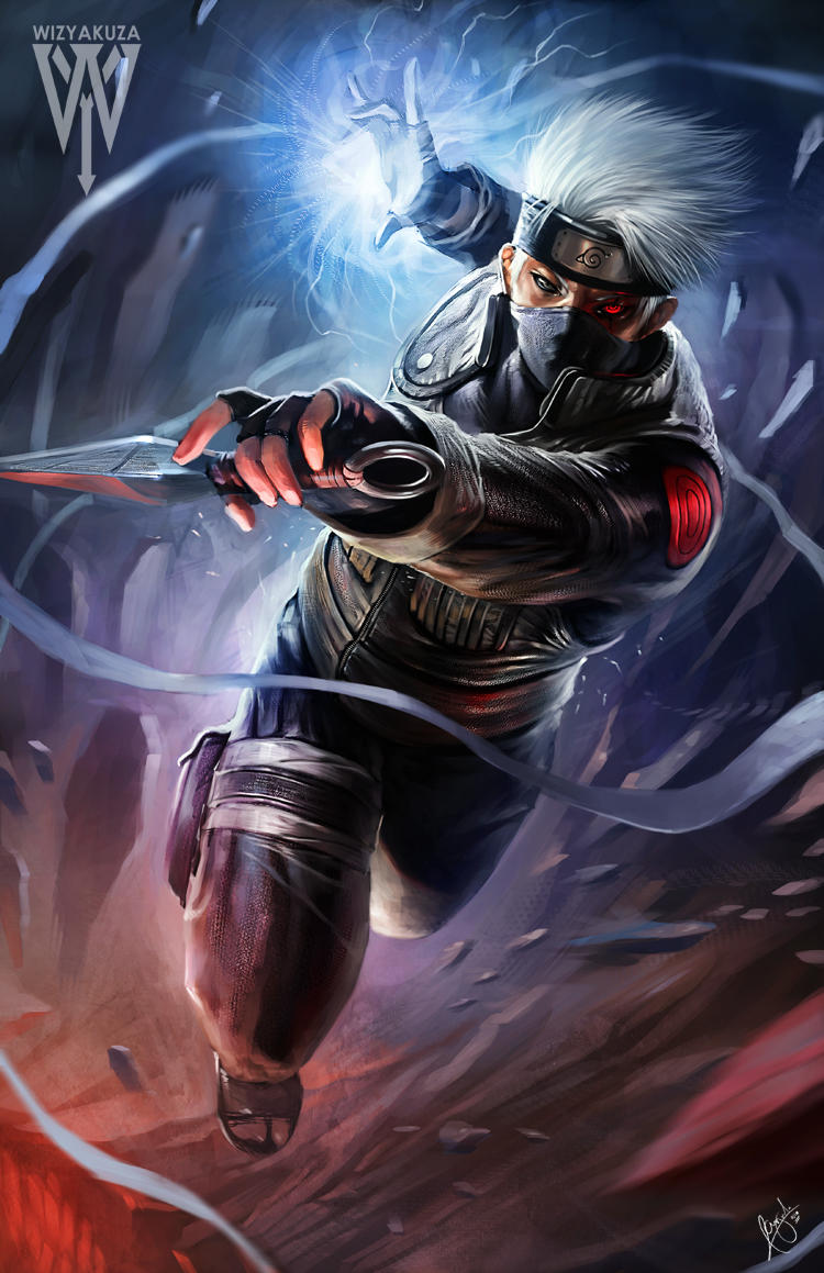1boy artist_name black_gloves chidori_(naruto) commentary commission covered_mouth english_commentary fingerless_gloves flak_jacket forehead_protector gloves hatake_kakashi heterochromia holding holding_weapon jacket konohagakure_symbol kunai long_sleeves looking_at_viewer male_focus mask mouth_mask naruto_(classic) naruto_(series) ninja ninja_mask realistic red_eyes sharingan short_hair signature sleeveless sleeveless_jacket solo spiked_hair uzumaki_symbol weapon white_hair wizyakuza