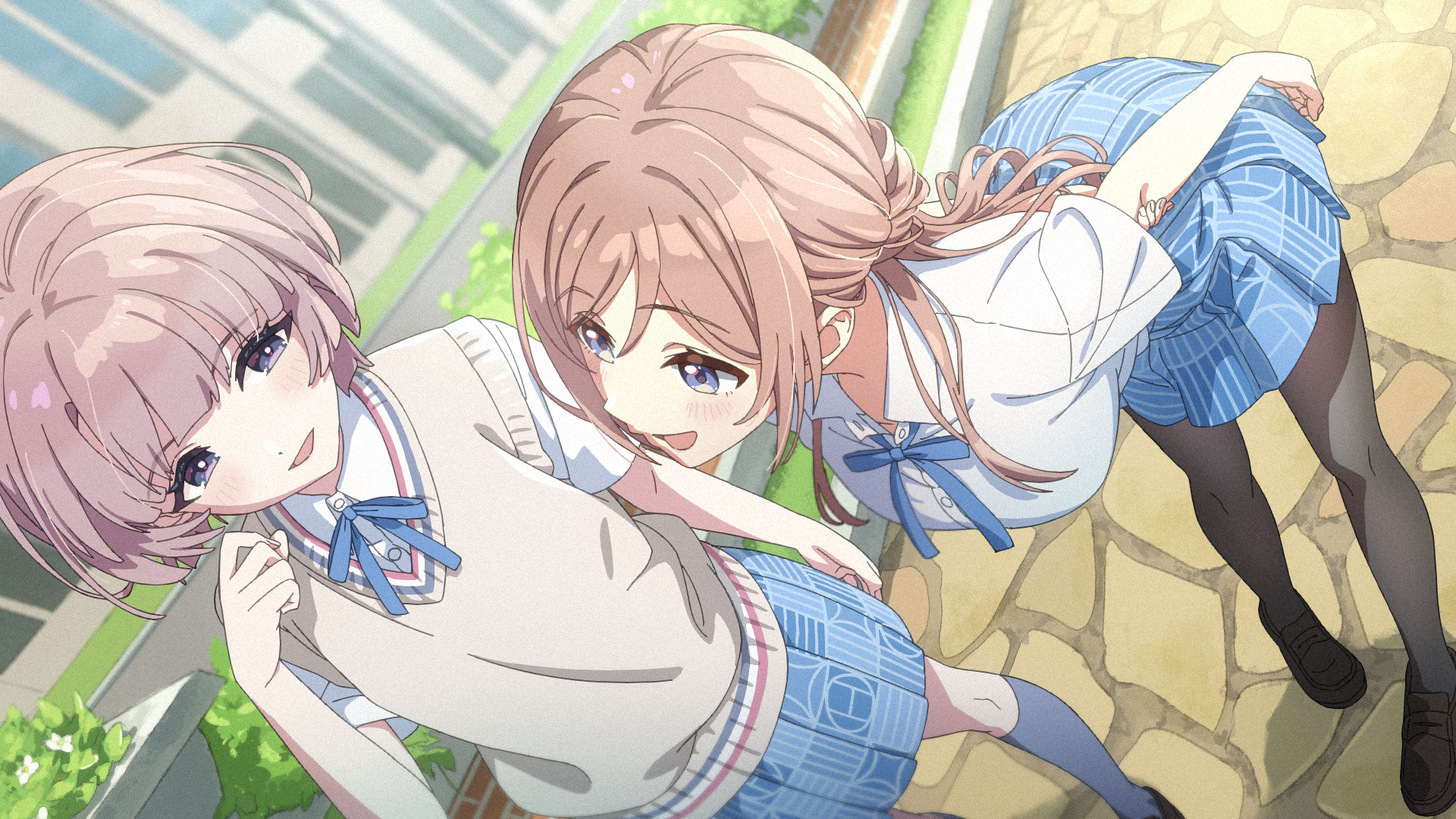 2girls arimura_mao black_pantyhose blue_ribbon blue_skirt blush breasts brown_hair commentary gakuen_idolmaster hatsuboshi_gakuen_school_uniform highres himesaki_rinami idolmaster large_breasts leaning_forward looking_at_another multiple_girls neck_ribbon outdoors pantyhose pink_hair pleated_skirt ribbon school_uniform shirt skirt smile sweater_vest untranslatable_commentary takada_(pixiv_97599311) white_shirt