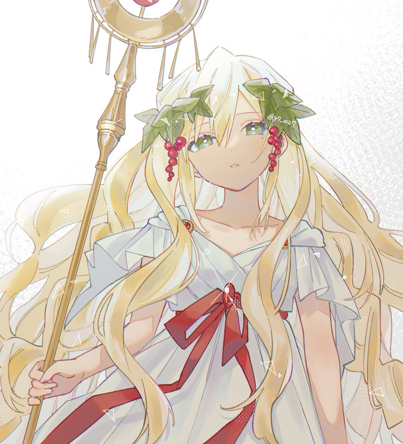 1girl blonde_hair dress food fruit grapes green_eyes hair_fruit hair_ornament highres holding leaf_hair_ornament long_hair looking_at_viewer magi_the_labyrinth_of_magic mole mole_under_eye parted_lips red_ribbon ribbon scheherazade_(magi) short_sleeves solo staff upper_body very_long_hair wavy_hair white_background white_dress yayoripain