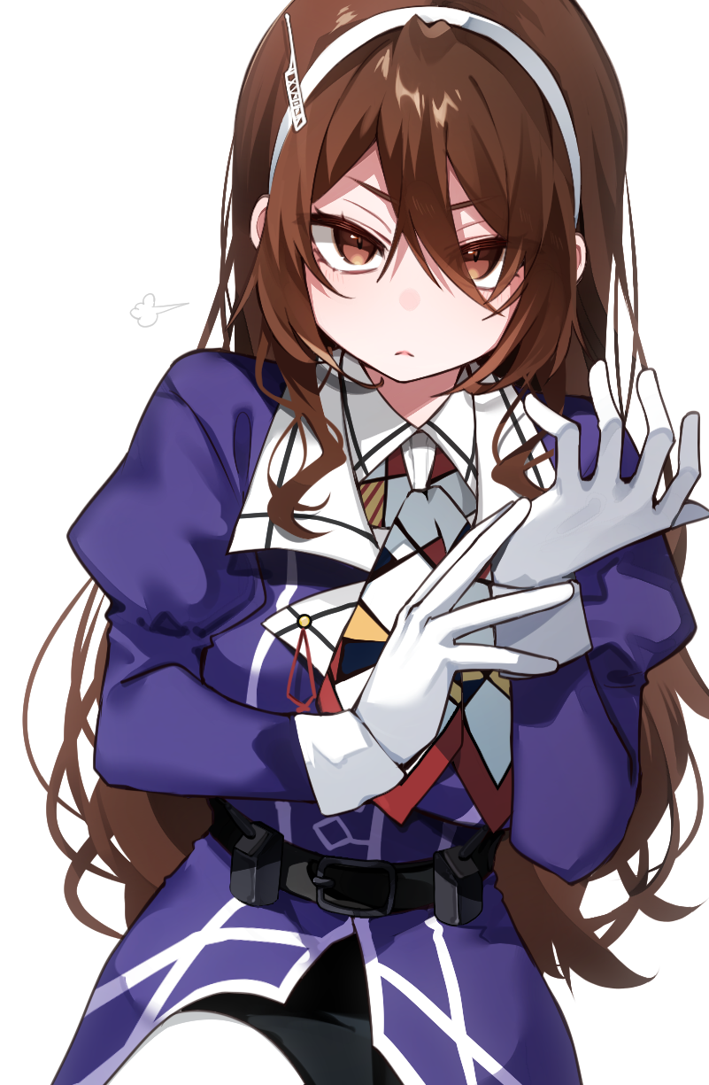 1girl ashigara_(kancolle) ashigara_kai_ni_(kancolle) belt black_skirt brown_eyes brown_hair gloves hairband highres jacket kantai_collection long_hair looking_at_viewer military_uniform multicolored_neckerchief neckerchief pantyhose pencil_skirt purple_jacket simple_background sitting skirt solo tsumikitsuki_(katsuobushi) wavy_hair white_background white_gloves white_hairband white_pantyhose