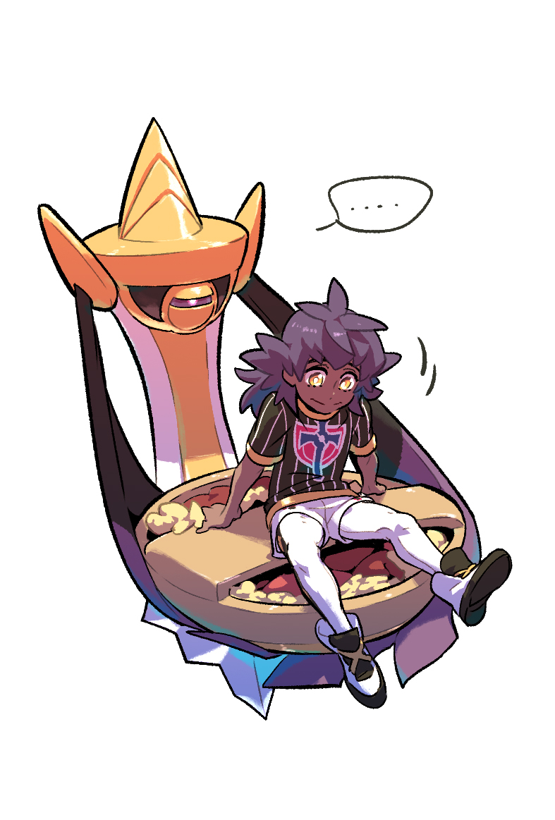 ... 1boy aegislash aged_down arm_support black_shirt bright_pupils champion_uniform closed_mouth commentary dark-skinned_male dark_skin gen_6_pokemon leggings leon_(pokemon) long_hair looking_down male_focus nintendo pokemon pokemon_(creature) pokemon_sword_and_shield purple_hair redlhzz shirt shoes short_sleeves shorts sitting split_mouth spoken_ellipsis untranslatable_commentary white_background white_footwear white_leggings white_pupils white_shorts yellow_eyes