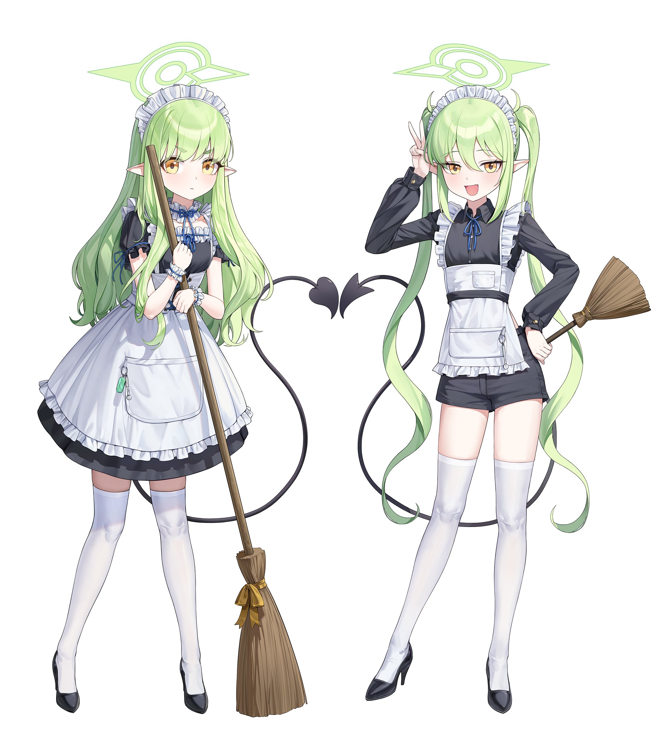 2girls absurdres alternate_costume apron black_dress black_footwear black_tail blue_archive blush broom closed_mouth cryturtle demon_tail dress enmaided frilled_apron frilled_sleeves frills full_body green_hair green_halo halo high_heels highres hikari_(blue_archive) holding holding_broom long_hair long_sleeves looking_at_viewer maid maid_apron maid_headdress multiple_girls nozomi_(blue_archive) open_mouth pointy_ears short_sleeves siblings simple_background sisters smile tail thighhighs twins twintails white_apron white_background white_thighhighs yellow_eyes