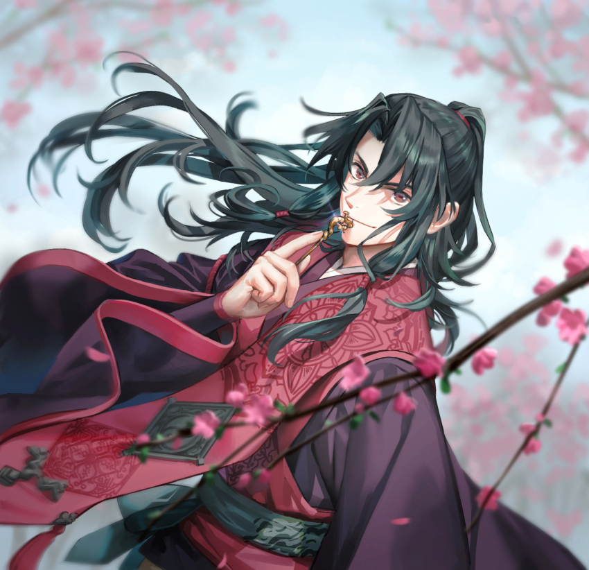 1boy black_hair blurry cherry_blossoms chinese_clothes chinese_hairpin depth_of_field fate/samurai_remnant fate_(series) hair_tie half_updo hanfu holding_hairpin keclpshvli long_hair long_sleeves looking_at_viewer low-tied_sidelocks male_focus red_eyes red_hanfu sash sidelocks smile solo tassel upper_body wide_sleeves wind wind_lift zheng_chenggong_(fate)