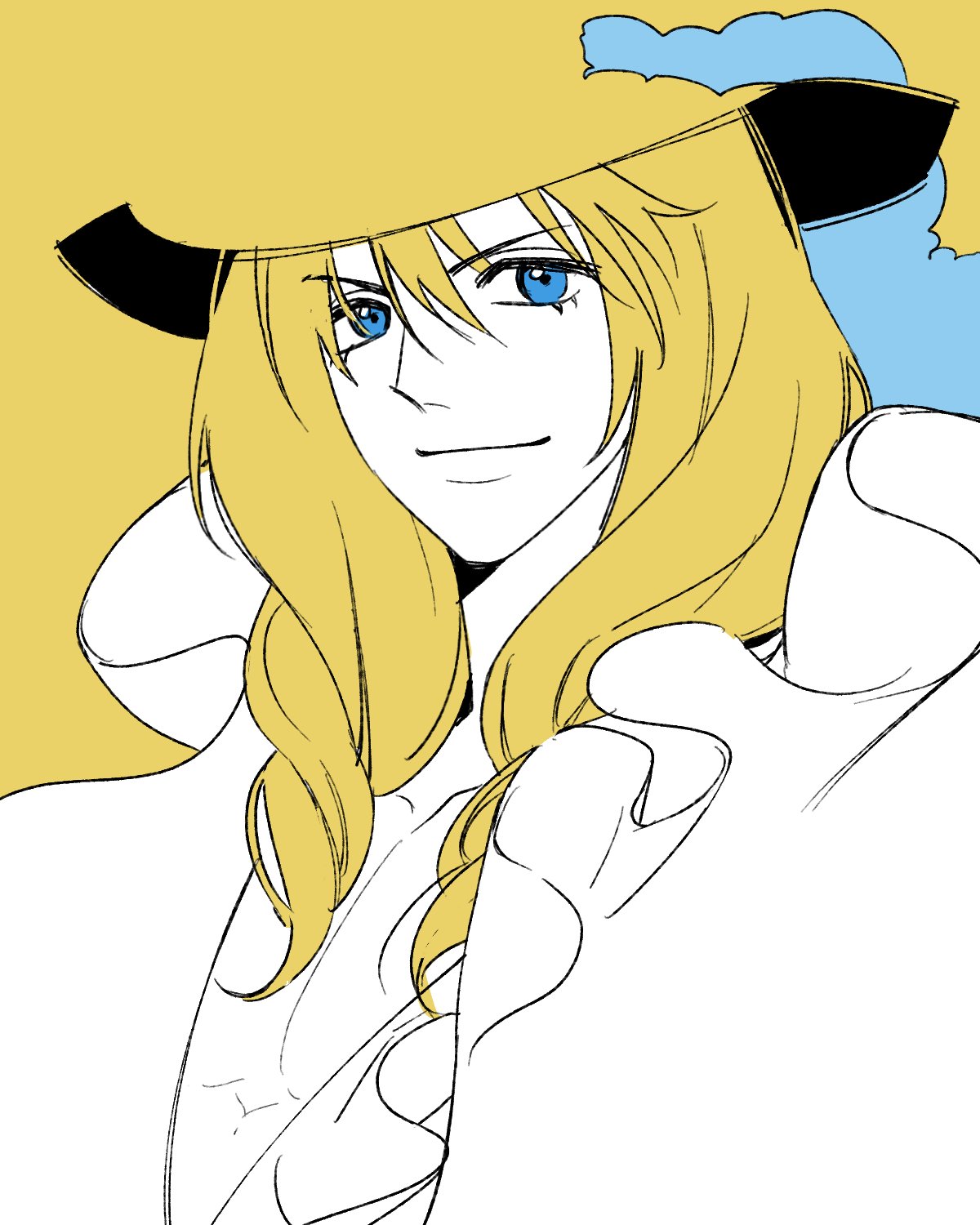 1boy blonde_hair blue_eyes cavendish_(one_piece) coat collar drill_hair eyelashes frilled_coat frilled_collar frills hair_between_eyes hat hat_feather highres long_hair looking_at_viewer male_focus one_piece ppyobong11 smile solo upper_body yellow_background