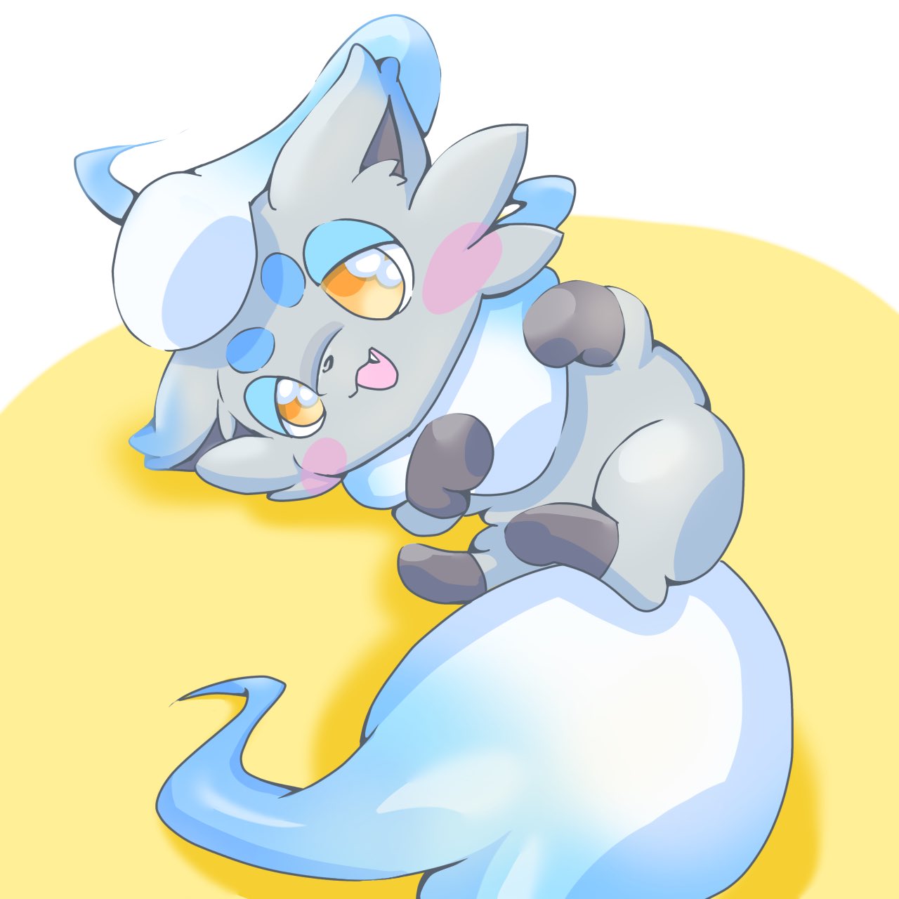 alternate_color animal_focus blue_hair blush blush_stickers fang fox half-closed_eyes highres hisuian_zorua kensan345 lying multicolored_hair nintendo no_humans on_side open_mouth pokemon pokemon_(creature) shiny_pokemon smile solo two-tone_hair white_hair yellow_eyes