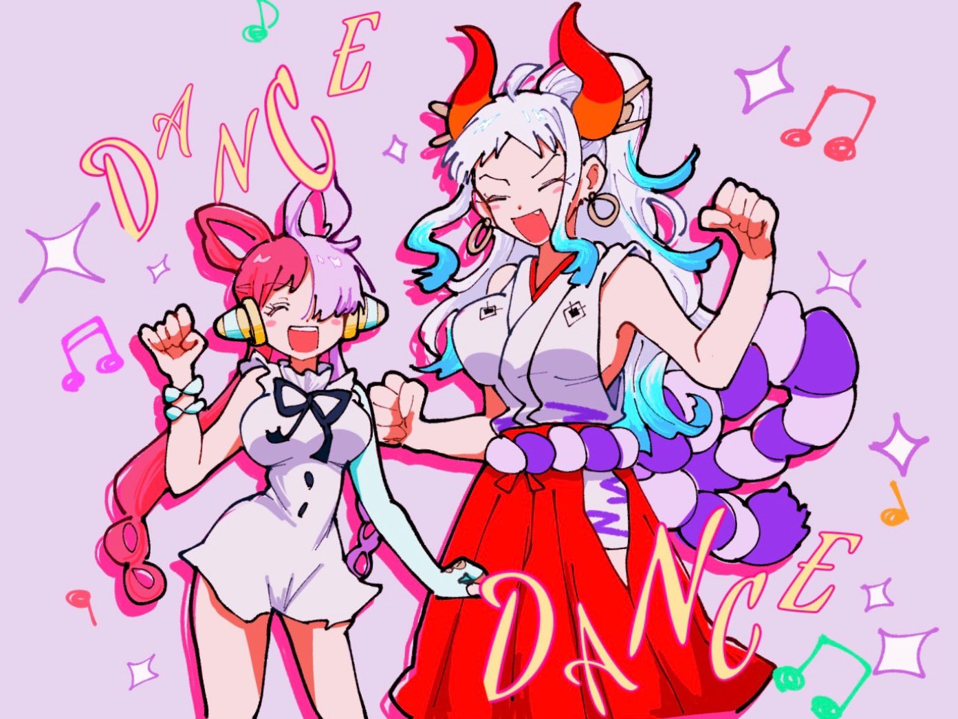 0h_my_god 2girls ^_^ aqua_hair bracelet clenched_hands closed_eyes commentary_request dancing dress earrings elbow_gloves gloves hair_ornament hair_over_one_eye hakama headphones horns japanese_clothes jewelry kimono multicolored_hair multiple_girls musical_note one_piece open_mouth ponytail red_hair red_hakama rope shimenawa short_dress single_elbow_glove sleeveless sleeveless_dress sleeveless_kimono sparkle twintails two-tone_hair uta_(one_piece) white_dress white_hair white_kimono yamato_(one_piece)