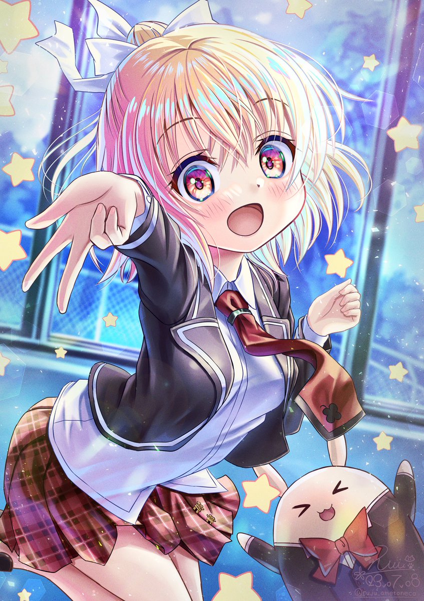 >_< 1girl 1other 2023 anne_happy artist_name blush bow bowtie breasts chain-link_fence day dot_nose fence formal_clothes hanakoizumi_an highres indoors looking_at_viewer medium_hair open_mouth ruju_amn school_uniform small_breasts star_(symbol) suit timothy_(anne_happy) v