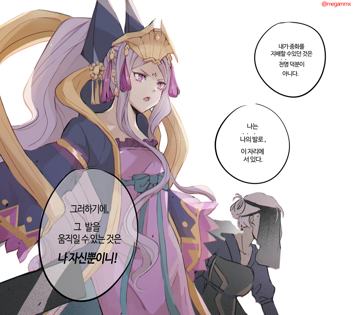 black_veil blue_coat bow chinese_clothes coat commentary covered_face fate/grand_order fate_(series) forehead_tattoo grey_bow grey_hair hagoromo hanfu korean_text kuli_(fate) long_hair long_sleeves looking_afar open_clothes open_coat open_mouth ponytail purple_eyes purple_hair purple_robe robe shawl shino_(mufn5785) short_hair sidelocks simple_background speech_bubble tassel tattoo tiara translation_request veil very_long_hair white_background wide_sleeves wu_zetian_(fate) yellow_shawl