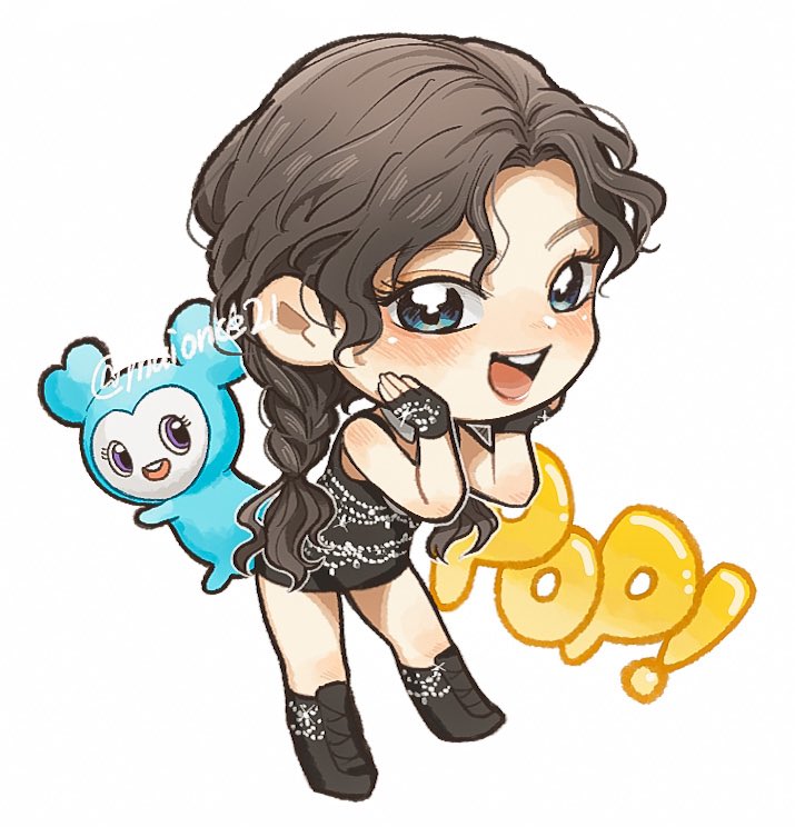 1girl animification black_boots black_dress black_gloves blue_eyes blush boots braid brown_hair chibi commentary creature dress english_commentary fingerless_gloves glint gloves hair_behind_ear k-pop leaning_forward long_hair maionce21 navely_(twice) nayeon_(twice) open_mouth real_life simple_background smile solo third-party_source twice_(group) twin_braids twitter_username white_background