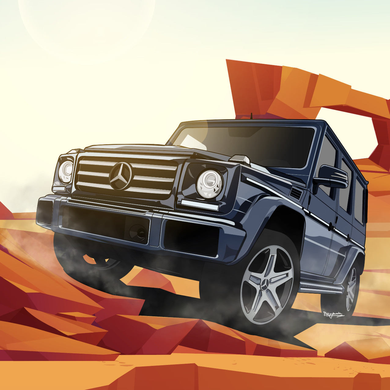 benjamin_(user_scjv3278) car desert highres logo mercedes-benz mercedes-benz_g-class no_humans original shadow signature smoke sports_utility_vehicle vehicle_focus
