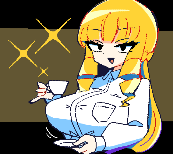 1girl black_eyes blonde_hair breasts cup drill_hair drill_sidelocks eyelashes holding holding_cup kaneda_mochiko large_breasts long_hair looking_at_viewer mount_celeb_kaneda-san nyaromeron open_mouth shirt sidelocks simple_background solo sparkle teacup thick_eyelashes very_long_hair white_shirt