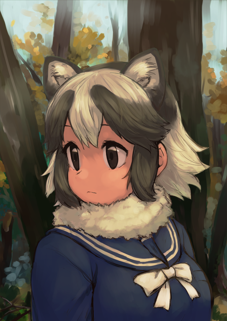 1girl animal_ear_fluff animal_ears black_eyes black_hair blue_serafuku bow bowtie commentary_request extra_ears forest fur_collar kemono_friends looking_to_the_side multicolored_hair nature raccoon_ears rumenia_(ao2is) school_uniform serafuku short_hair solo tanuki_(kemono_friends) tree two-tone_hair upper_body white_bow white_bowtie white_hair