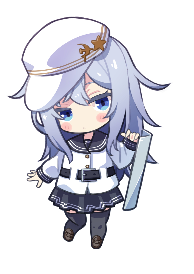 1girl black_sailor_collar black_shoes black_skirt black_thighhighs blue_eyes blush closed_mouth full_body grey_hair hammer_and_sickle hat hat_ornament hibiki_(kancolle) kantai_collection long_hair long_sleeves pleated_skirt sailor_collar sanninme_no_haru shoes simple_background skirt solo star_(symbol) star_hat_ornament thighhighs verniy_(kancolle) white_background white_hat