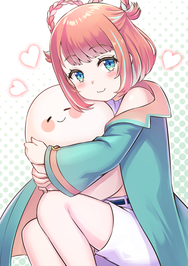 1girl :3 belt black_belt blue_cape blue_eyes blush_stickers braid cape closed_eyes closed_mouth commentary_request commission green_background heart hug indie_virtual_youtuber jun_ch_(vtuber) looking_at_viewer outline pink_shorts purple_shirt red_hair s_(hdru2332) shirt short_hair shorts sitting skeb_commission smile solo stuffed_animal stuffed_toy virtual_youtuber white_background white_outline
