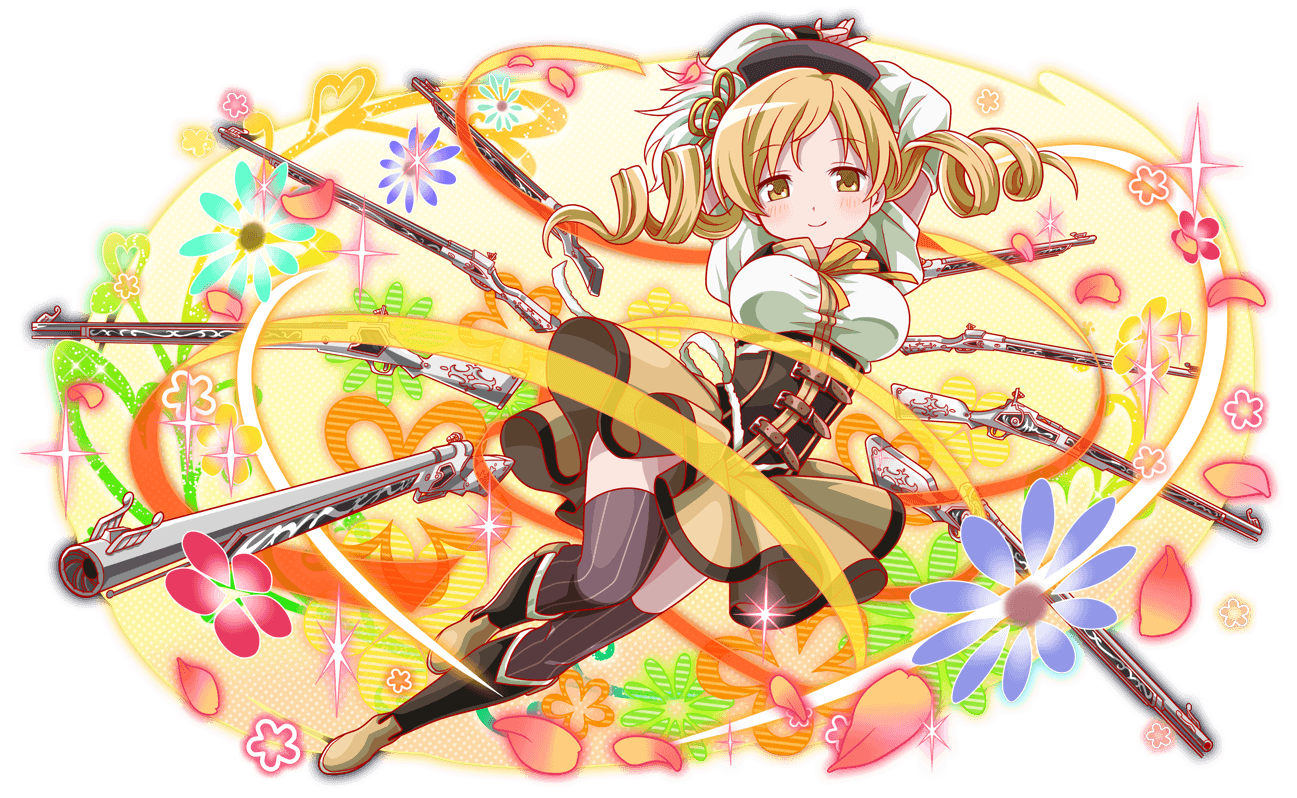 1girl arms_behind_head arms_up artist_request belt belt_buckle beret black_boots black_hat blonde_hair blush boots breasts brown_belt brown_corset brown_thighhighs buckle closed_mouth corset crash_fever detached_sleeves dot_nose drill_hair facing_viewer floating floating_object flower flower_symbol full_body game_cg gradient_petals gun half-closed_eyes hat heart high_collar knee_boots large_breasts long_hair long_sleeves looking_at_viewer mahou_shoujo_madoka_magica mahou_shoujo_madoka_magica_(anime) multicolored_boots multicolored_hair multiple_weapons neck_ribbon official_art official_style outline parted_bangs petals pink_petals pleated_skirt polka_dot puffy_long_sleeves puffy_short_sleeves puffy_sleeves red_outline ribbon saturated shirt short_sleeves shotgun sidelocks simple_background skirt smile solo sparkle striped_clothes striped_corset striped_thighhighs swept_bangs tachi-e thighhighs tomoe_mami tomoe_mami_(magical_girl) transparent_background twin_drills two-tone_boots two-tone_hair underbust vertical-striped_clothes vertical-striped_corset vertical-striped_thighhighs weapon white_shirt white_sleeves yellow_background yellow_boots yellow_eyes yellow_ribbon yellow_skirt yellow_theme