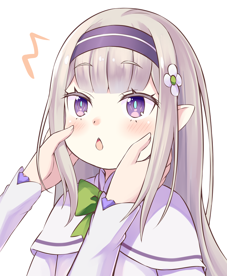2girls blue_pupils blunt_bangs blush bow capelet character_request chestnut_mouth closed_mouth commentary_request dress emilia_(re:zero) flower green_bow hair_flower hair_ornament hands_on_another's_cheeks hands_on_another's_face light_brown_hair long_hair long_sleeves multiple_girls open_mouth pointy_ears purple_eyes re:zero_kara_hajimeru_isekai_seikatsu s_(hdru2332) surprised upper_body white_background white_capelet white_dress white_flower