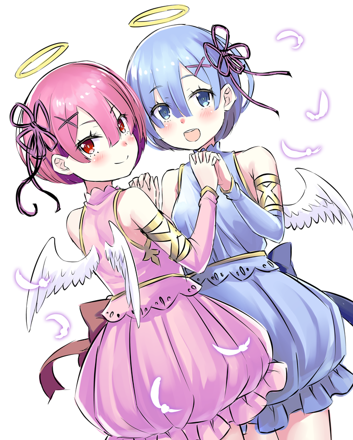 2girls alternate_costume bare_shoulders blue_dress blue_eyes blue_hair blush commentary_request detached_sleeves dress feathers hair_ornament hair_ribbon halo holding_hands looking_at_viewer looking_back multiple_girls open_mouth pink_dress pink_hair pink_ribbon ram_(re:zero) re:zero_kara_hajimeru_isekai_seikatsu red_eyes rem_(re:zero) ribbon s_(hdru2332) siblings simple_background sisters smile standing teeth traditional_halo twins upper_teeth_only white_background x_hair_ornament yellow_halo