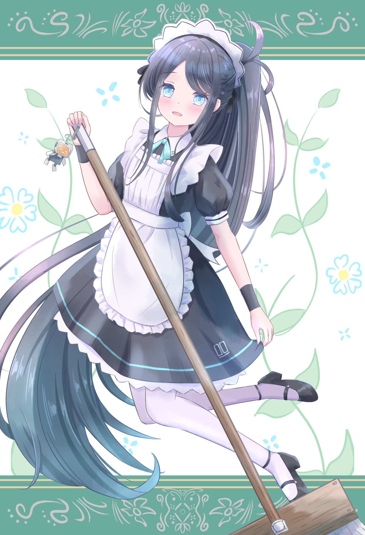 1girl akaneuta_chitose aris_(blue_archive) blue_archive blue_eyes blue_hair highres long_hair looking_at_viewer maid open_mouth short_sleeves solo