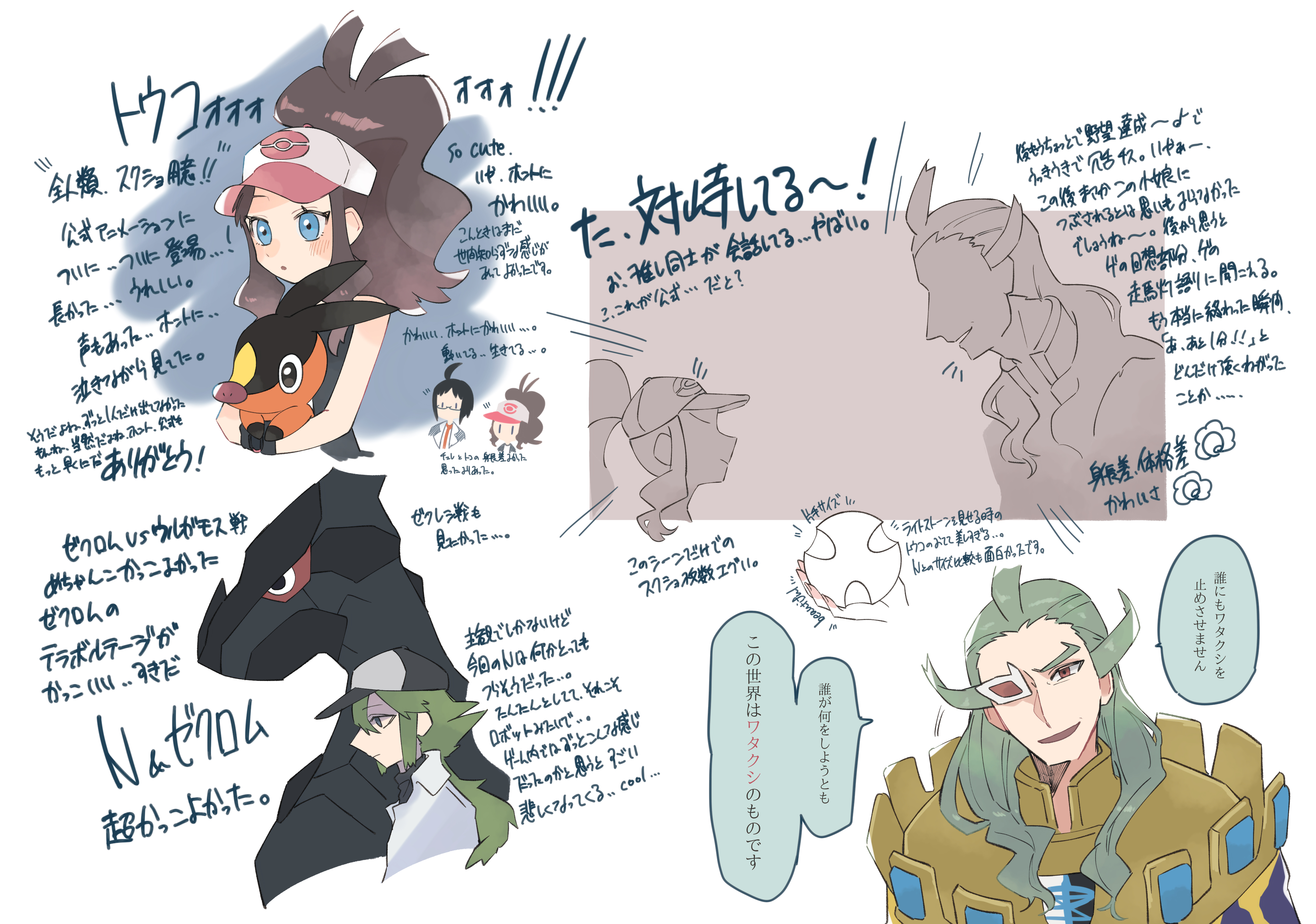 1girl 3boys absurdres black_vest blue_eyes blush brown_hair cheren_(pokemon) commentary_request earpiece gen_5_pokemon ghetsis_(pokemon) green_hair hat high_ponytail highres hilda_(pokemon) hime_(himetya105) holding holding_pokemon legendary_pokemon long_hair multiple_boys multiple_views n_(pokemon) nintendo notice_lines open_mouth poke_ball_print pokemon pokemon_(creature) pokemon_black_and_white ponytail shirt sidelocks smile speech_bubble tepig translation_request vest white_background white_hat white_shirt zekrom