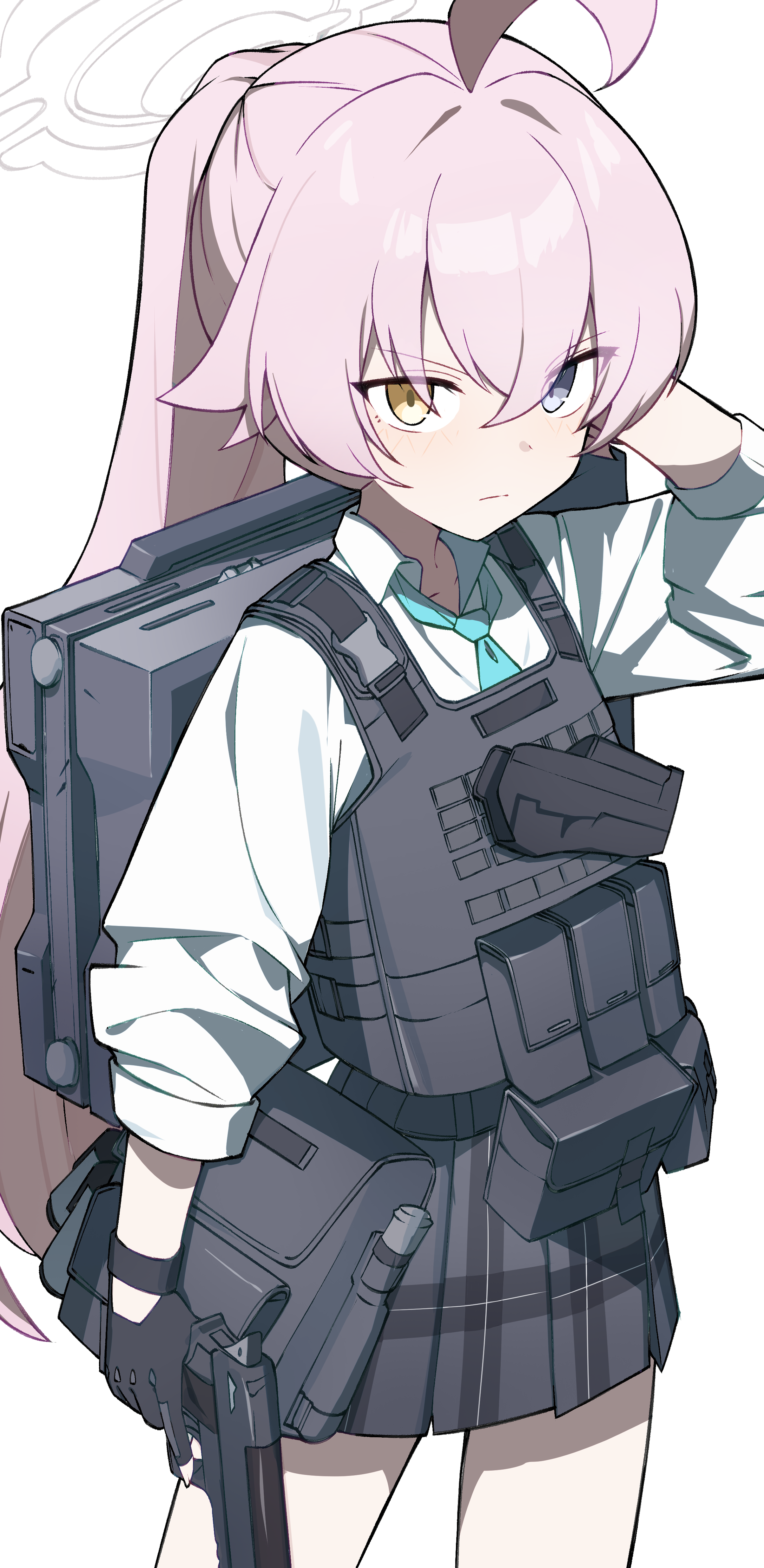 1girl absurdres ahoge black_gloves black_skirt black_vest blue_archive blue_eyes closed_mouth collared_shirt cowboy_shot fingerless_gloves fingernails gloves gun hair_between_eyes halo heterochromia highres holding holding_gun holding_weapon hoshino_(armed)_(blue_archive) hoshino_(blue_archive) lil_monster_(zbuta_turatan) long_hair looking_at_viewer official_alternate_costume official_alternate_hairstyle pink_hair pleated_skirt ponytail shirt simple_background skirt solo vest weapon white_background white_shirt yellow_eyes