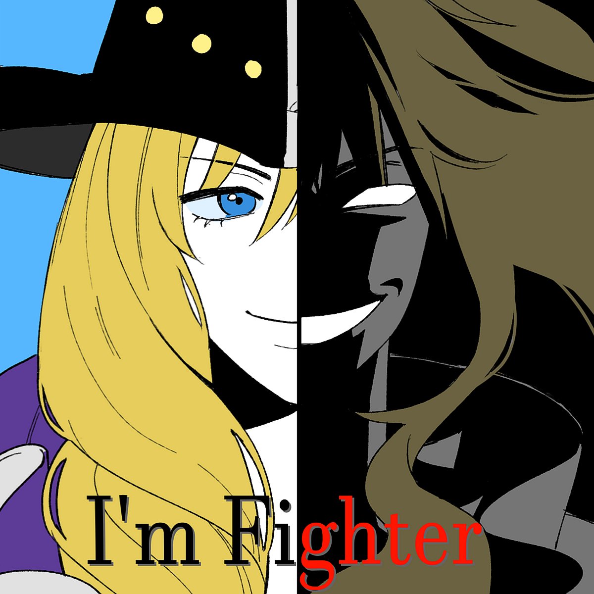 1boy black_hat blank_eyes blonde_hair blue_background blue_eyes cavendish_(one_piece) close-up closed_mouth collar commentary drill_hair dual_persona english_text evil_grin evil_smile floating_hair frilled_collar frills grin hair_between_eyes hakuba_(one_piece) hat highres i'm_fine_(meme) korean_commentary long_hair looking_to_the_side male_focus one_piece ppyobong11 smile
