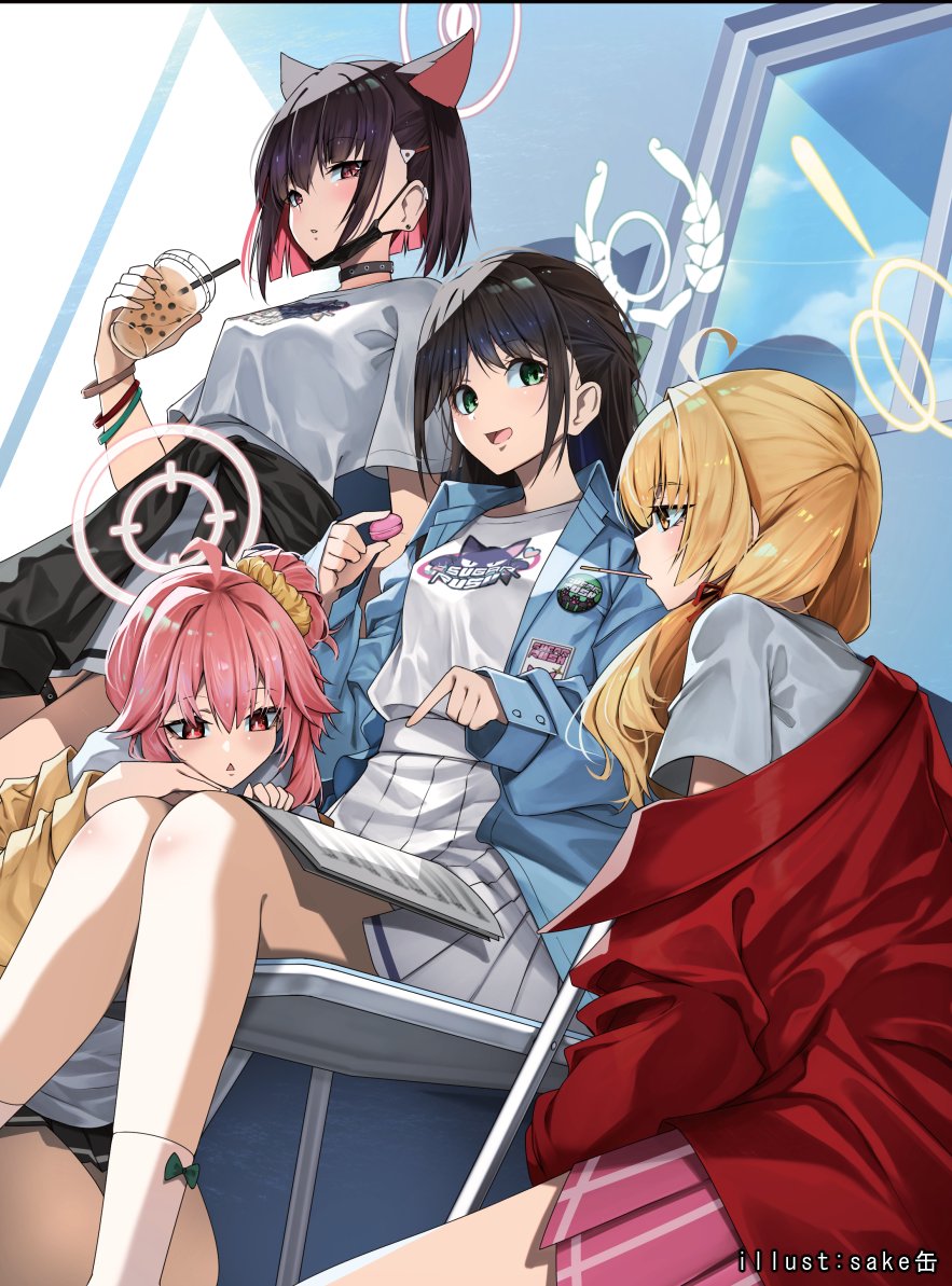 4girls after-school_sweets_club_(blue_archive) ahoge airi_(band)_(blue_archive) airi_(blue_archive) animal_ears black_choker black_hair black_jacket black_mask blonde_hair blue_archive blue_jacket blush breasts bubble_tea cat_ears choker drink drinking_straw extra_ears green_eyes green_halo halo holding holding_drink jacket jacket_on_shoulders kazusa_(band)_(blue_archive) kazusa_(blue_archive) large_breasts long_hair long_sleeves low_twintails mask mask_pull medium_breasts mouth_mask multiple_girls natsu_(band)_(blue_archive) natsu_(blue_archive) official_alternate_costume open_clothes open_jacket open_mouth parted_lips pink_hair pink_halo pink_skirt pleated_skirt red_eyes red_jacket sakesakana_(korezyanai) shirt short_hair short_sleeves skirt smile twintails white_shirt white_skirt yellow_eyes yellow_halo yellow_jacket yoshimi_(band)_(blue_archive) yoshimi_(blue_archive)