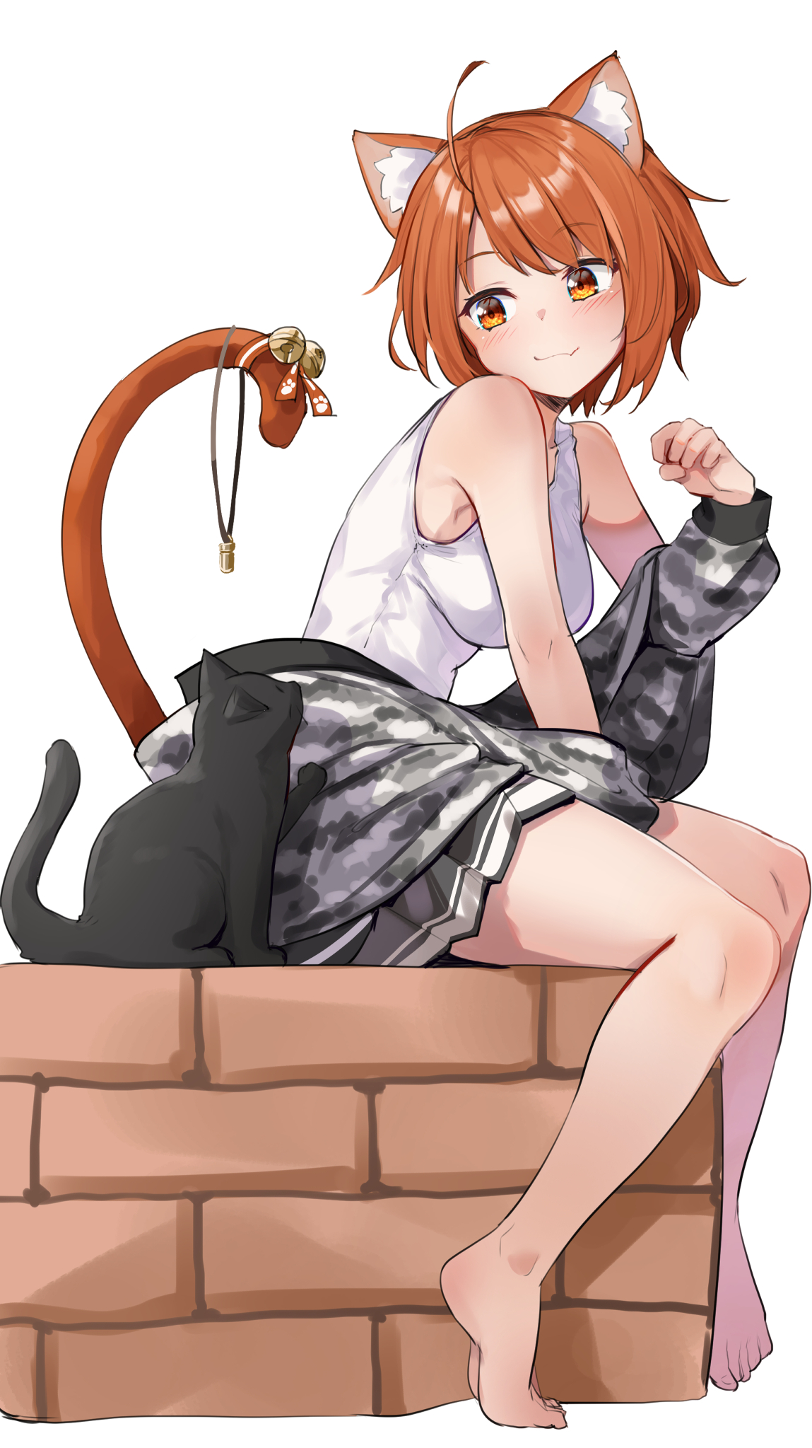 1girl ahoge animal_ears barefoot bell blush breasts camouflage camouflage_jacket cat cat_ears cat_girl cat_tail character_request copyright_request fang highres jacket long_sleeves looking_at_another medium_breasts orange_eyes orange_hair paw_pose shirt short_hair simple_background sitting skin_fang sleeveless sleeveless_shirt solo tail tail_bell tail_ornament white_background white_shirt yuuzuki_(re'ef)