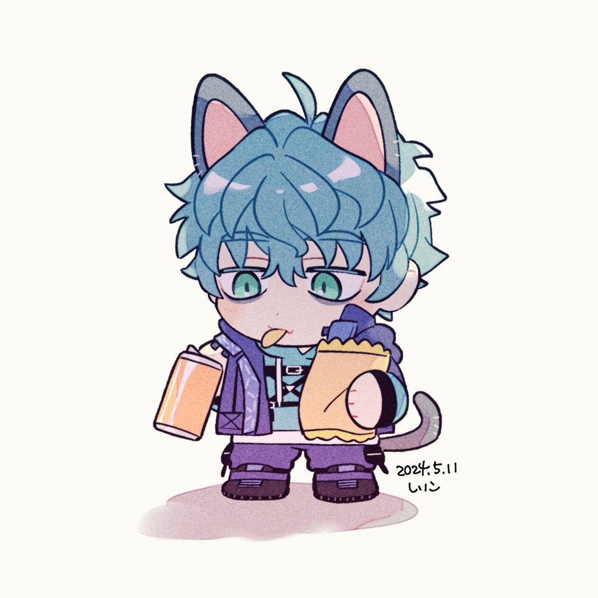 1boy 2024 adk-em animal_ears artist_name bandai bandai_namco blue_hair blue_jacket blue_jeans blue_sweater can cat_ears cat_tail chibi chips_(food) eating eyebrows food green_eyes highres ishimori_prod jacket kamen_rider liber_entertainment looking_at_object ride_kamens ruui_(ride_kamens) shadow shi_ko128 shoes slam_days sweater tagme tail toei_company twitter white_background