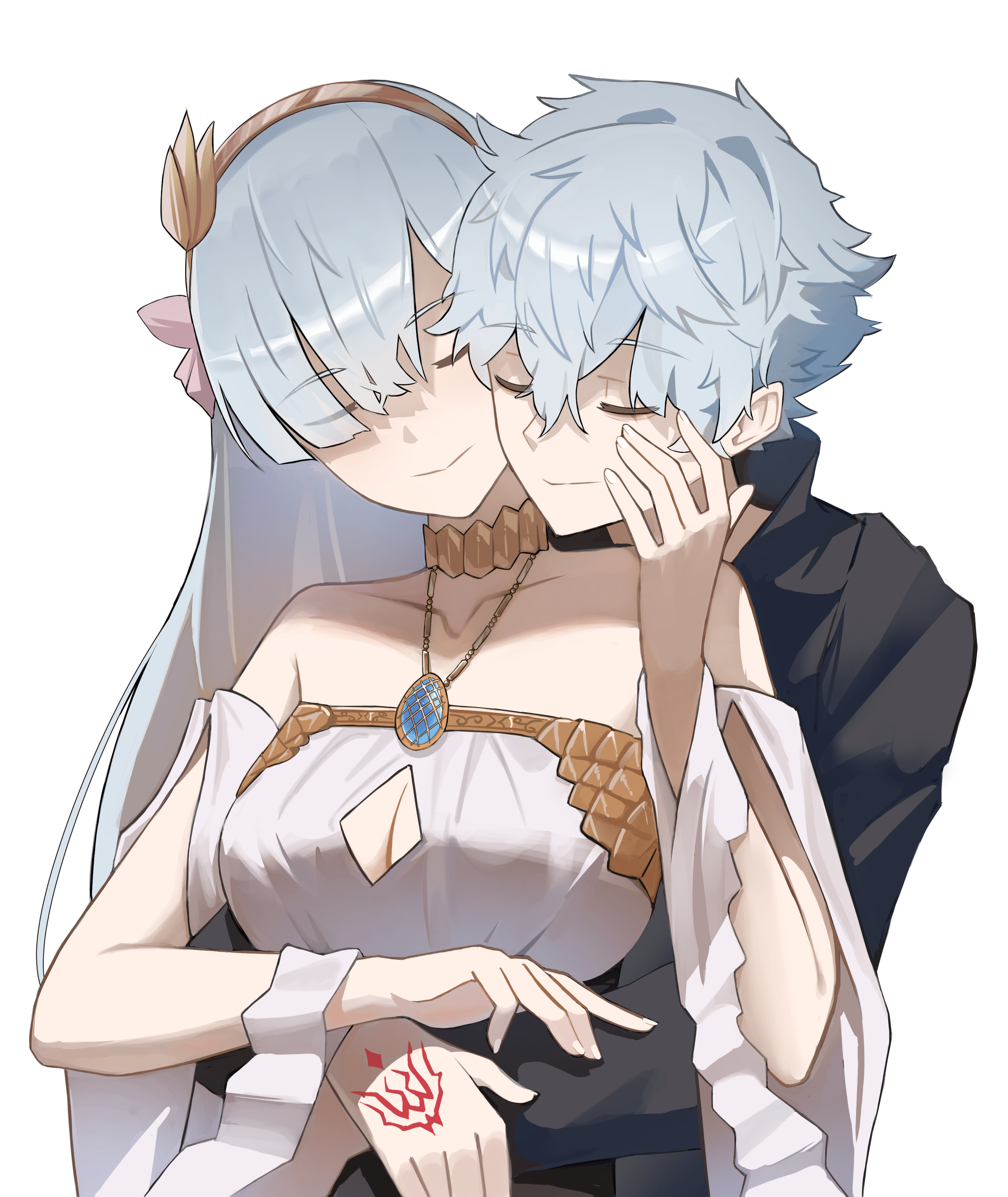 1boy 1girl absurdres anastasia_(fate) bare_shoulders black_shirt breasts closed_eyes collarbone command_spell commission dress fate/grand_order fate_(series) grey_hair hand_on_another's_head hetero highres hug hug_from_behind jewelry kadoc_zemlupus large_breasts long_hair necklace noir_(noir_reveur) shirt short_hair white_dress