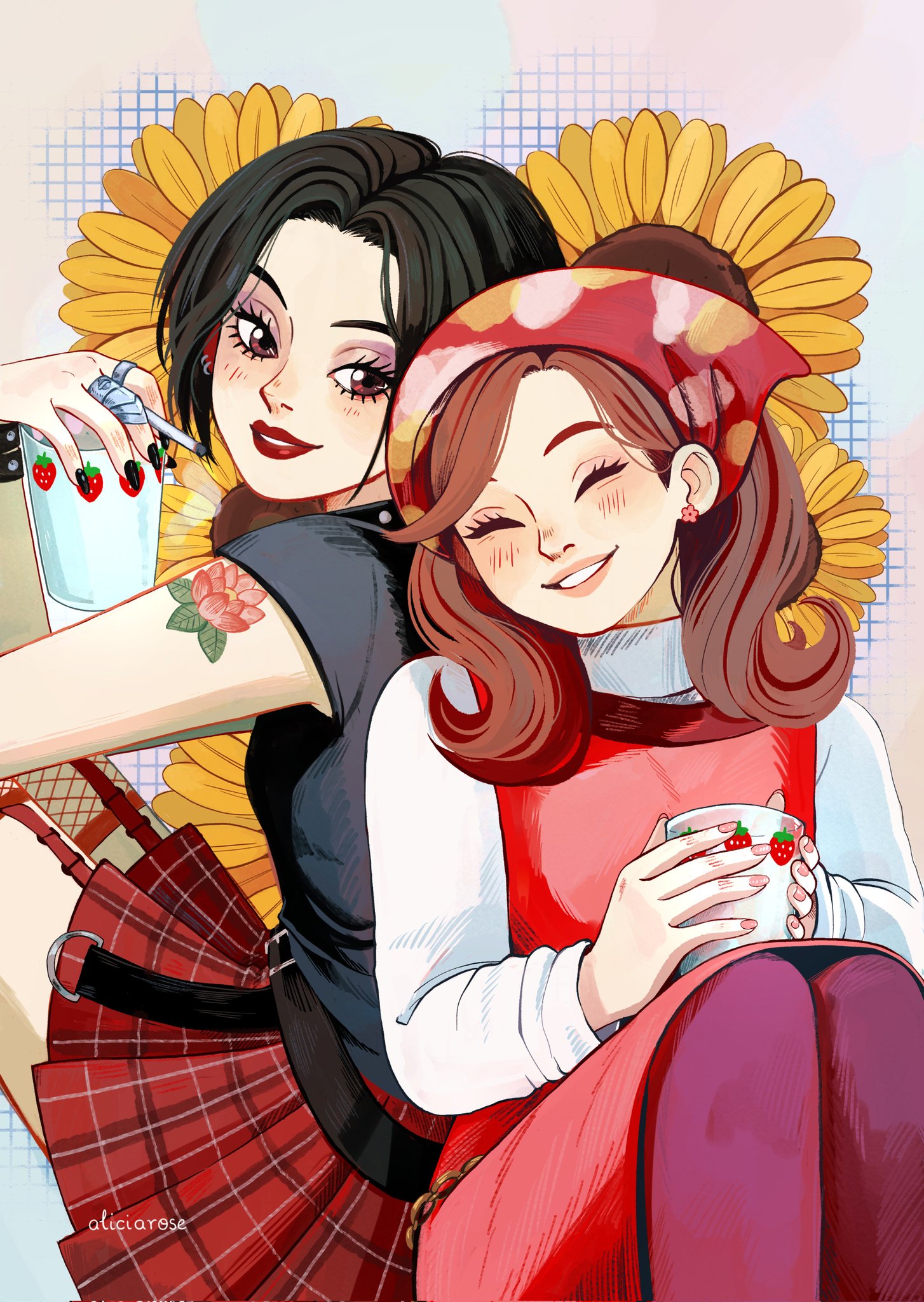 2girls ^_^ alicia_rose arm_tattoo artist_name black_hair black_nails black_shirt blush brown_hair cigarette closed_eyes commentary cup dress earrings english_commentary eyeshadow flower food_print fruit_print headscarf highres holding holding_cigarette holding_cup jewelry komatsu_nana looking_at_viewer makeup mascara medium_hair multiple_girls nana_(series) osaki_nana pantyhose pink_nails purple_eyeshadow red_dress red_headscarf red_lips ring shirt short_hair sitting skirt smile smoke strawberry_print sunflower swept_bangs tattoo