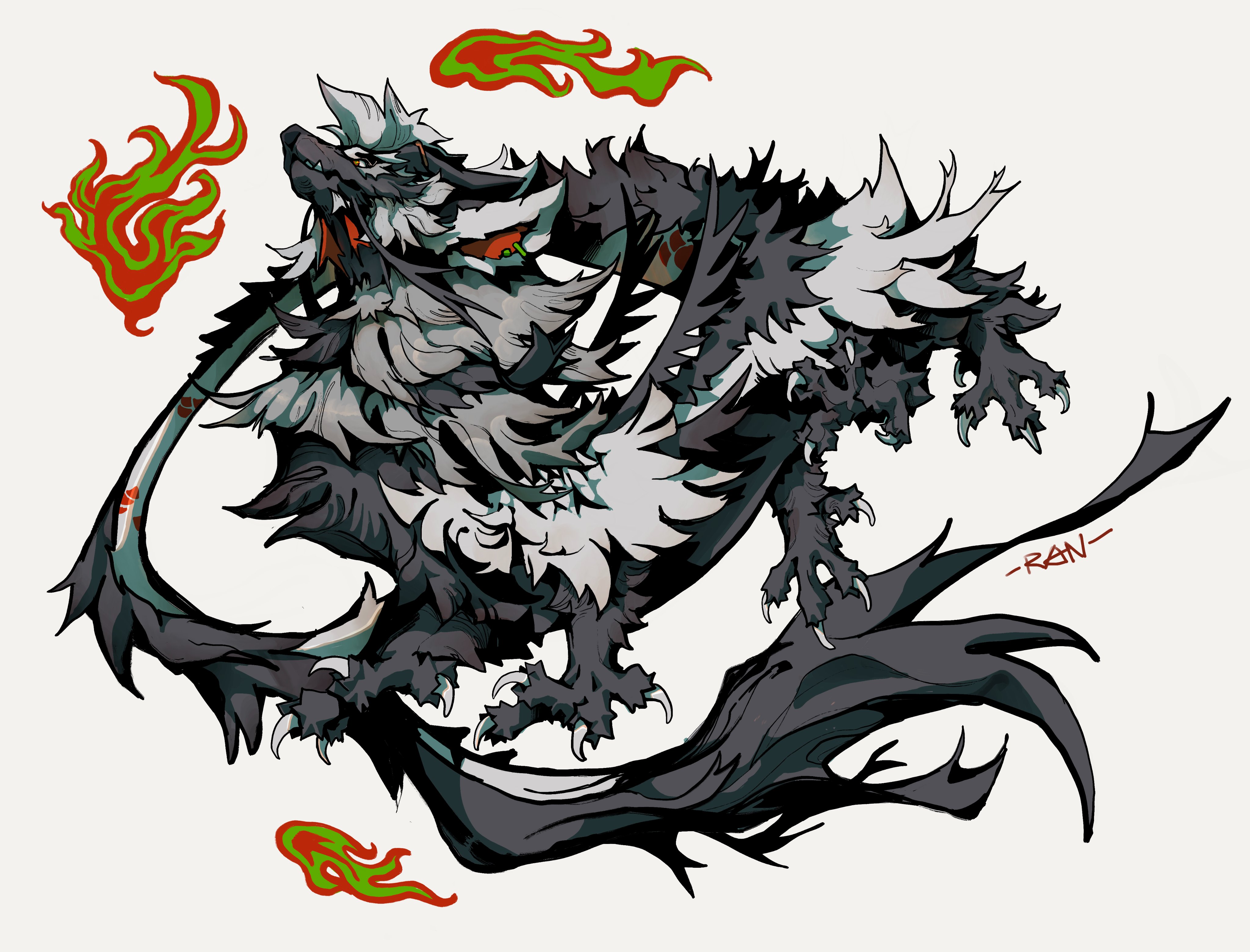 absurdres animal_focus artist_name chinese_commentary claws commentary_request dragon eastern_dragon fire from_side full_body furred_dragon highres horns monster multiple_legs no_humans original ran_(yitanran) signature slit_pupils solo tail thick_outlines