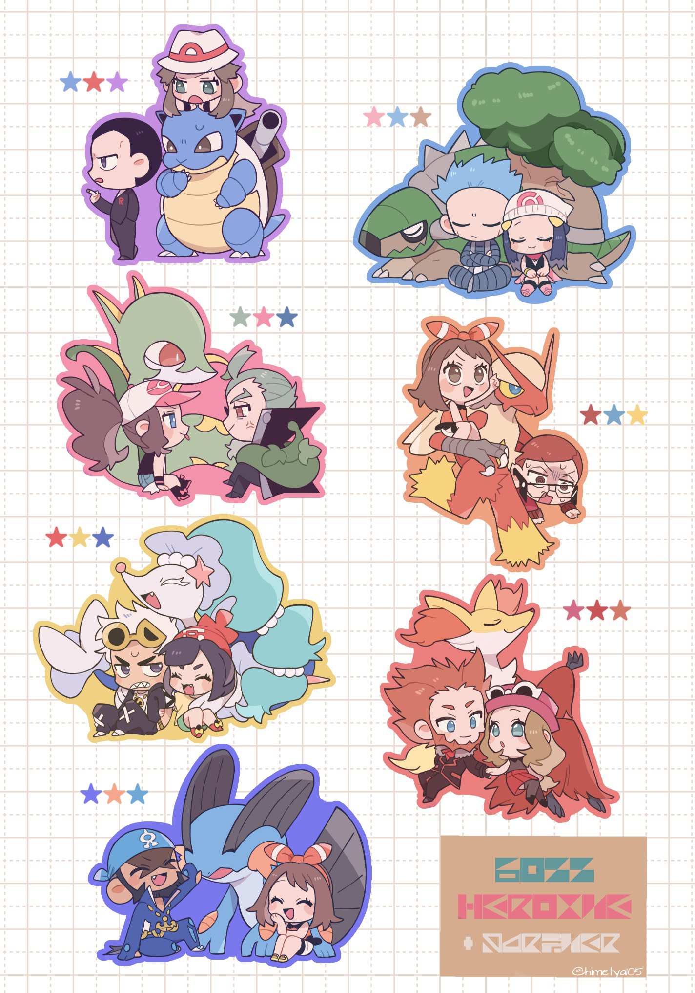 6+boys 6+girls :d anger_vein archie_(pokemon) beanie black_hair blastoise blaziken blue_hair brown_eyes brown_hair chibi clenched_teeth commentary_request cyrus_(pokemon) dawn_(pokemon) delphox eyelashes formal_clothes gen_1_pokemon gen_3_pokemon gen_4_pokemon gen_5_pokemon gen_6_pokemon gen_7_pokemon ghetsis_(pokemon) giovanni_(pokemon) green_hair grid_background guzma_(pokemon) hair_flaps hat highres hilda_(pokemon) hime_(himetya105) jacket leaf_(pokemon) lysandre_(pokemon) maxie_(pokemon) may_(pokemon) multiple_boys multiple_girls nintendo open_mouth pants pink_hat pleated_skirt pokemon pokemon_(creature) pokemon_black_and_white pokemon_black_2_and_white_2 pokemon_diamond/pearl/platinum pokemon_firered_and_leafgreen pokemon_omega_ruby_and_alpha_sapphire pokemon_sun_and_moon pokemon_x_and_y ponytail primarina riding riding_pokemon selene_(pokemon) serena_(pokemon) serperior sharp_teeth shirt short_hair sidelocks sitting skirt smile standing star_(symbol) suit sunglasses swampert teeth tongue tongue_out torterra white_hair white_hat