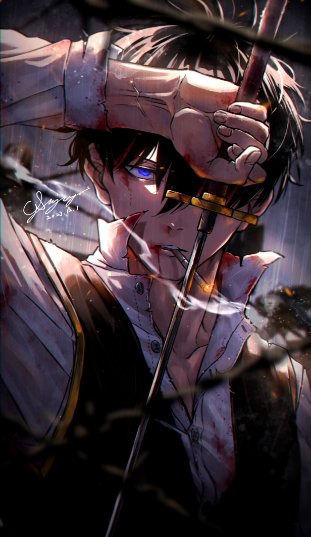 1boy artist_name aya_shiro423 black_hair blood blood_on_clothes blood_on_mouth blue_eyes blurry blurry_background blurry_foreground cigarette dated gintama hand_up hijikata_toushirou holding holding_weapon long_sleeves male_focus mouth_hold outdoors rain smoke smoking solo sword teeth_hold veins weapon wet