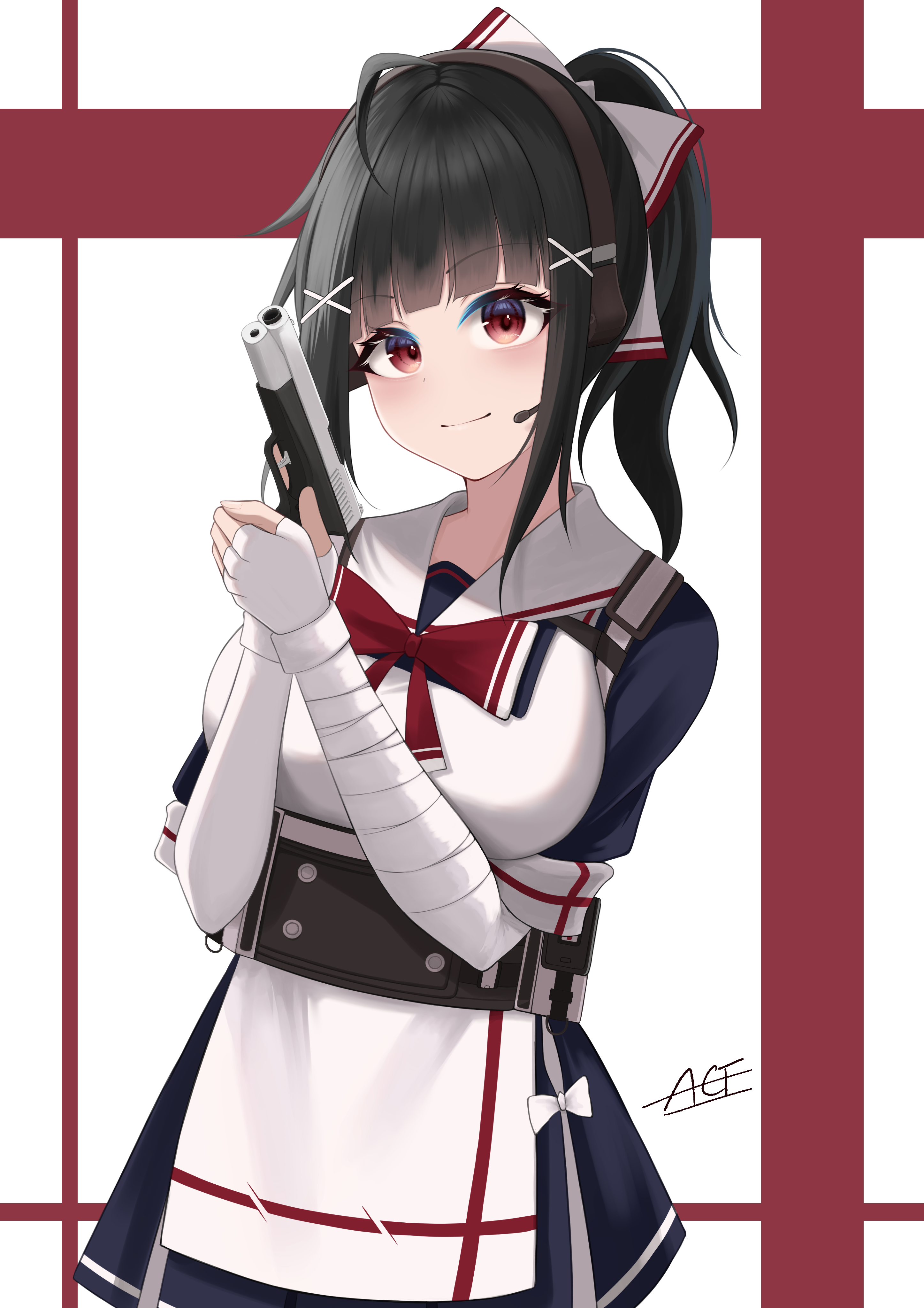 1girl absurdres bandaged_arm bandages black_hair breasts closed_mouth codename696 fingerless_gloves girls'_frontline gloves gsh-18 gsh-18_(girls'_frontline) gsh-18_(mod3)_(girls'_frontline) gun hair_ornament handgun highres holding holding_gun holding_weapon ponytail red_eyes solo weapon