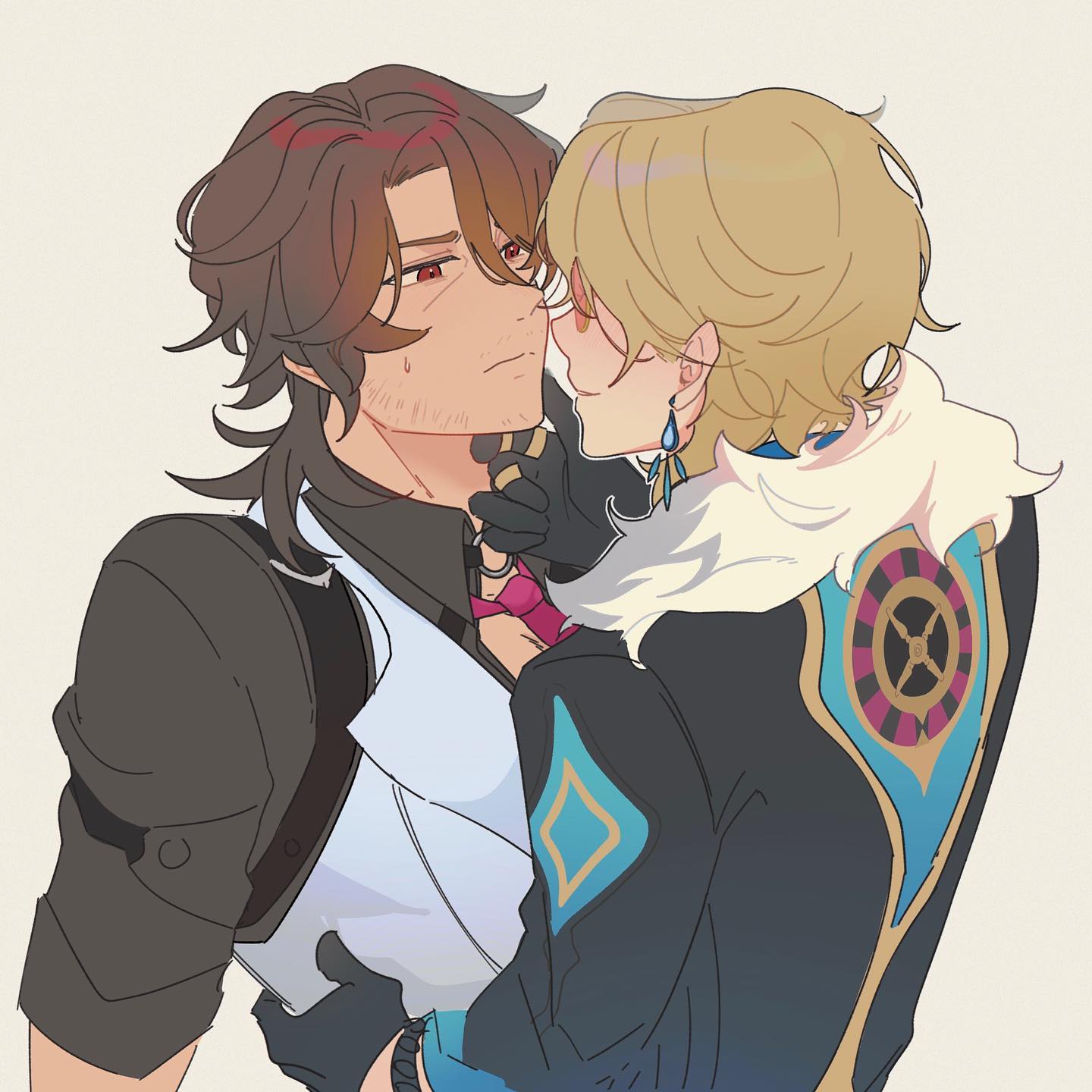 2boys aventurine_(honkai:_star_rail) black_gloves blonde_hair brown_hair ceniwen gallagher_(honkai:_star_rail) gloves highres honkai:_star_rail honkai_(series) kiss mihoyo multiple_boys sunglasses yaoi