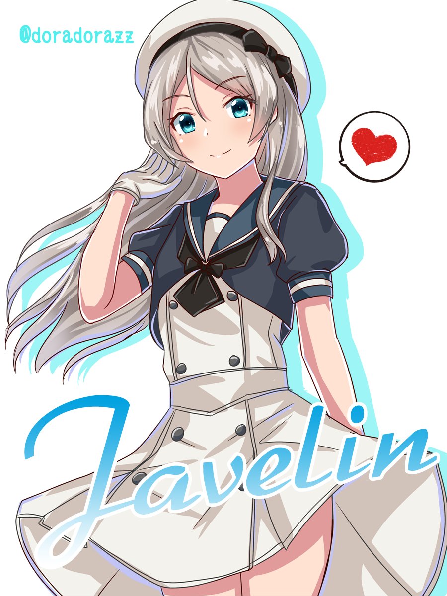 1girl black_jacket black_neckerchief blue_eyes blue_sailor_collar character_name cowboy_shot dress gloves grey_hair hat heart highres jacket javelin_(kancolle) kantai_collection long_hair looking_at_viewer loose_hair_strand neckerchief roko_roko_(doradorazz) sailor_collar sailor_dress sailor_hat short_sleeves simple_background solo spoken_heart twitter_username white_background white_dress white_gloves white_hat
