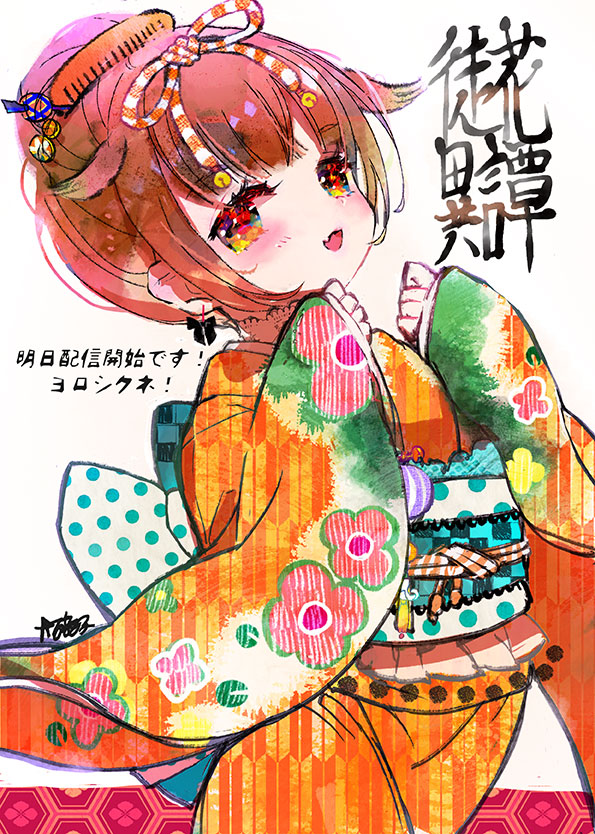 1girl adabana_itan blush brown_hair comb copyright_name cowboy_shot fang furisode hair_bun hair_flaps hair_ribbon hands_up japanese_clothes kimono long_sleeves looking_at_viewer obi obiage obijime ooishi_ryuuko open_mouth orange_eyes orange_kimono print_kimono ribbon sash short_hair single_hair_bun skin_fang sleeves_past_wrists smile solo translation_request unmoving_pattern urikohime_(adabana_itan) white_background wide_sleeves yagasuri