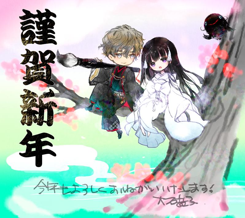 1boy 1girl adabana_itan black_footwear black_hair black_hakama black_haori black_kimono brown_hair calligraphy_brush carrying_over_shoulder closed_mouth creature egasumi gradient_background green_background hair_ornament hakama haori holding holding_calligraphy_brush holding_paintbrush in_tree japanese_clothes kimono knee_up kurofude_(adabana_itan) long_hair long_sleeves looking_at_another looking_at_viewer looking_to_the_side obi ooishi_ryuuko open_mouth oversized_object paintbrush purple_background purple_eyes sash shirohime_(adabana_itan) short_hair side-by-side sitting sitting_in_tree sleeves_past_fingers sleeves_past_wrists smile tassel tassel_hair_ornament tree white_eyes white_kimono white_sash wide_sleeves