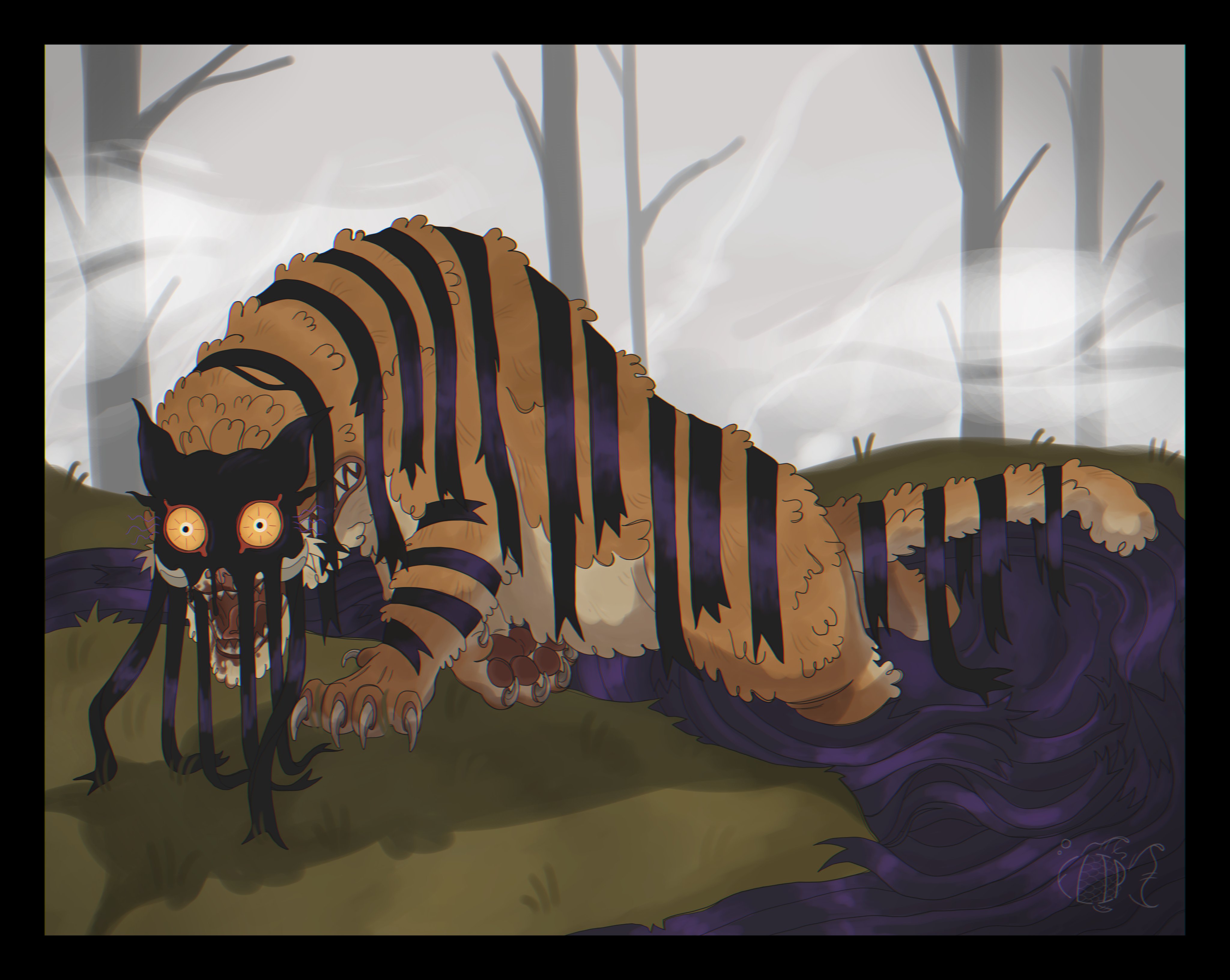 absurdres animal_focus bare_tree black_border blood blood_on_face border claws constricted_pupils dream_tiger_(govy9807) fl1p fog from_side full_body grass highres liquid looking_at_viewer mask monster no_humans open_mouth orange_fur original outdoors pawpads sharp_teeth solo teeth tiger tree tusks wide_mouth yellow_eyes