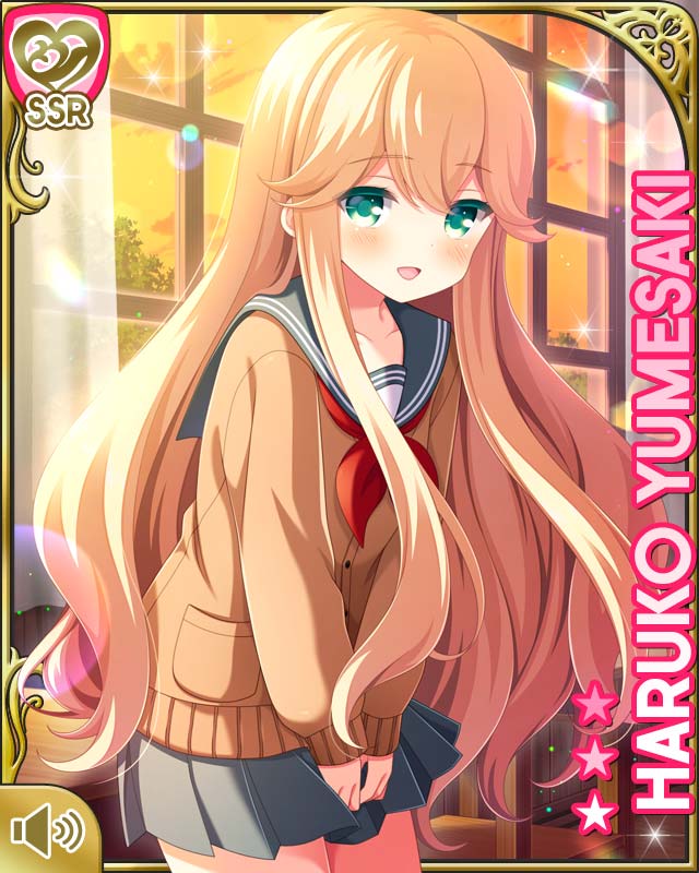 1girl :d alternate_costume blonde_hair brown_cardigan cardigan character_name evening girlfriend_(kari) green_eyes grey_skirt indoors long_hair necktie official_art open_mouth pleated_skirt qp:flapper red_necktie school school_uniform shirt skirt smile standing tagme white_shirt window yumesaki_haruko